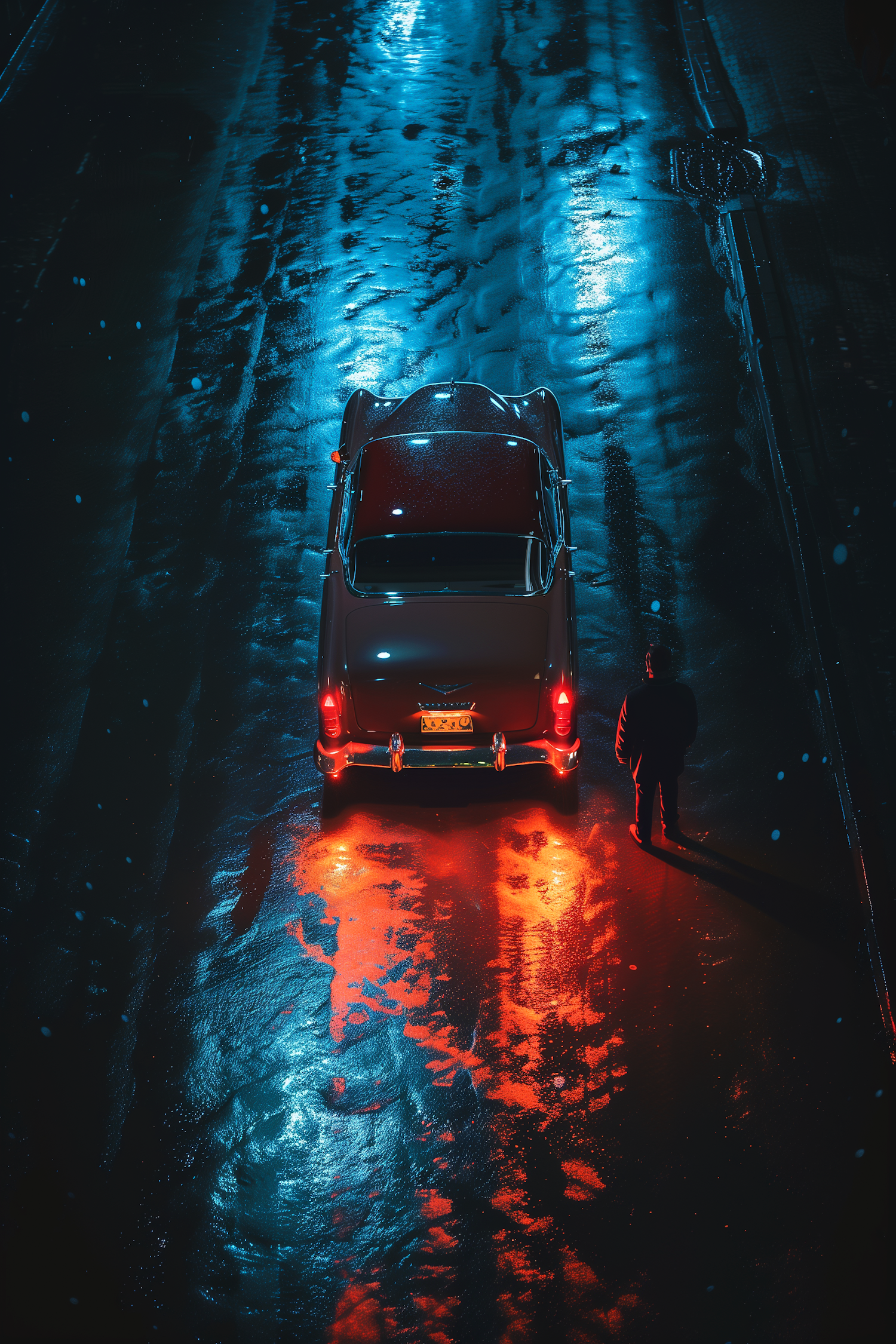 Moody night scene with a vintage car on a wet street, red taillights glowing, and a lone figure casting a shadow.