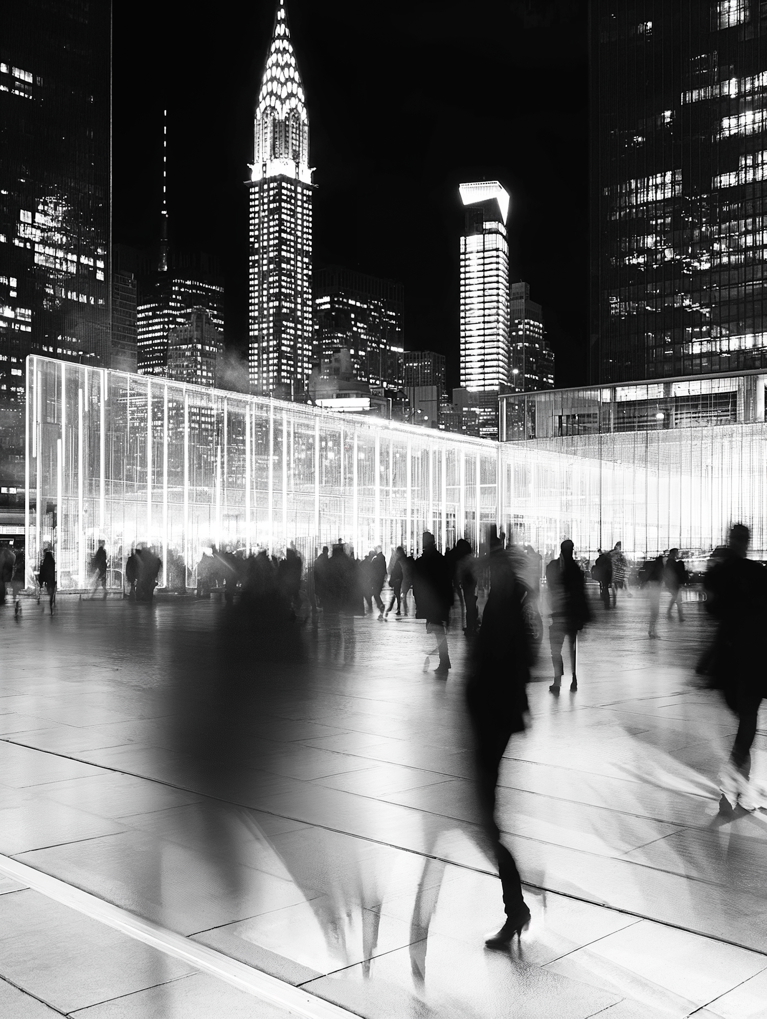 Dynamic black-and-white cityscape with blurred figures in motion, iconic skyscrapers, and a glowing glass structure at night.