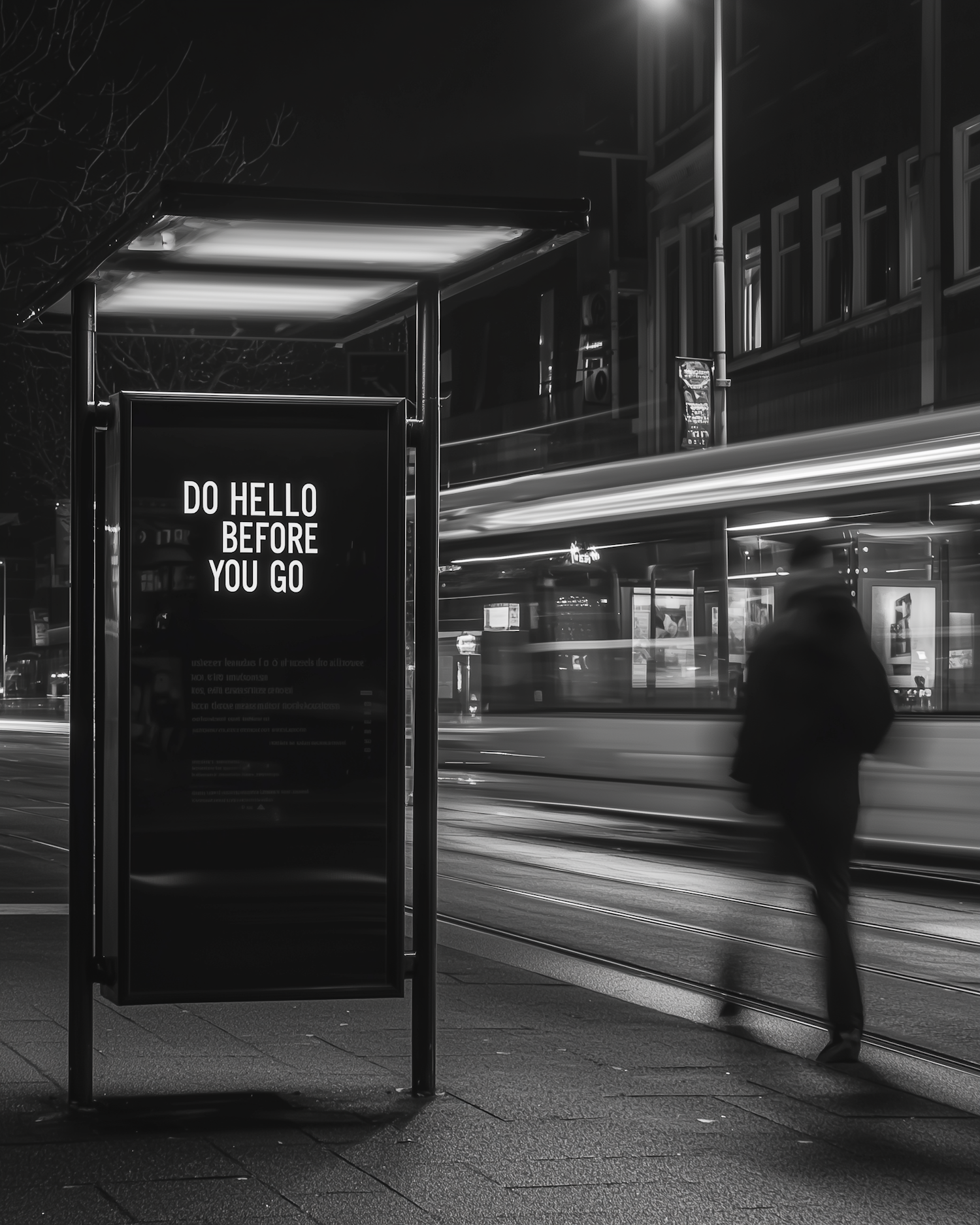 Black-and-white urban night scene with a glowing bus stop sign reading 'DO HELLO BEFORE YOU GO,' blurred pedestrian, and motion-streaked tram.