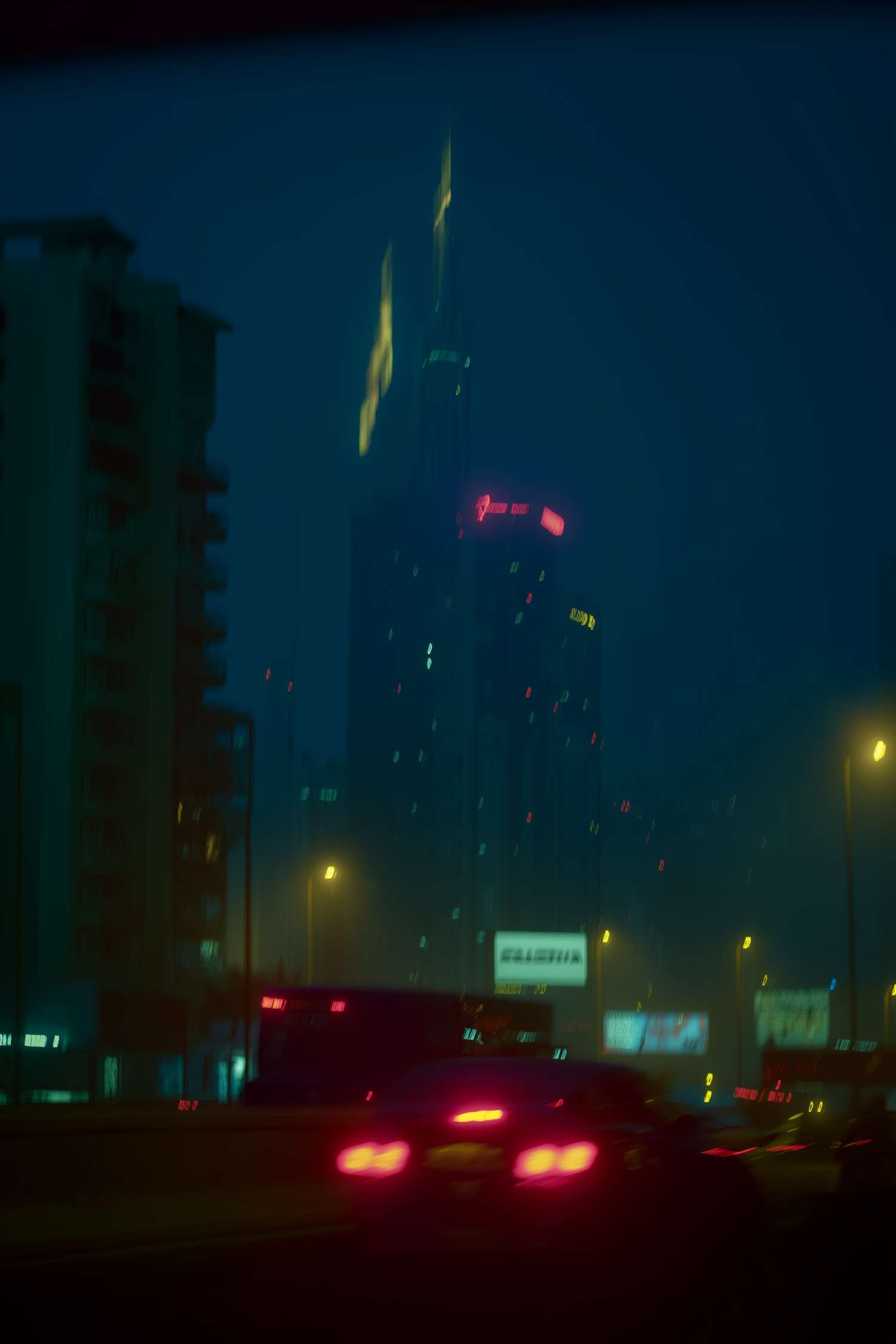 A moody urban night scene with blurred car lights, glowing skyscrapers, and neon signs in a misty cityscape.