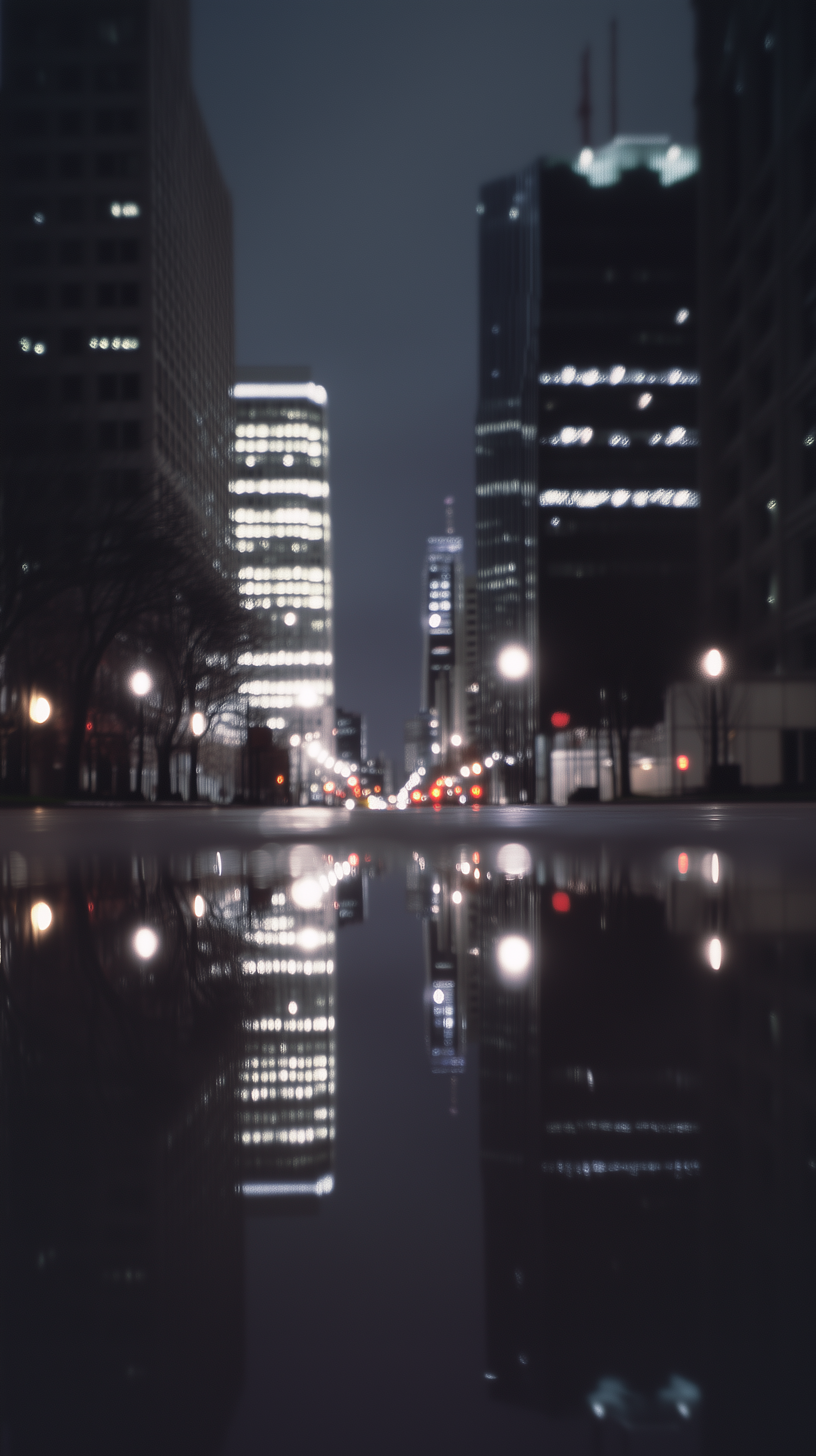 A serene city street at night with glowing skyscrapers and reflections on a wet surface, creating a symmetrical and tranquil urban view.