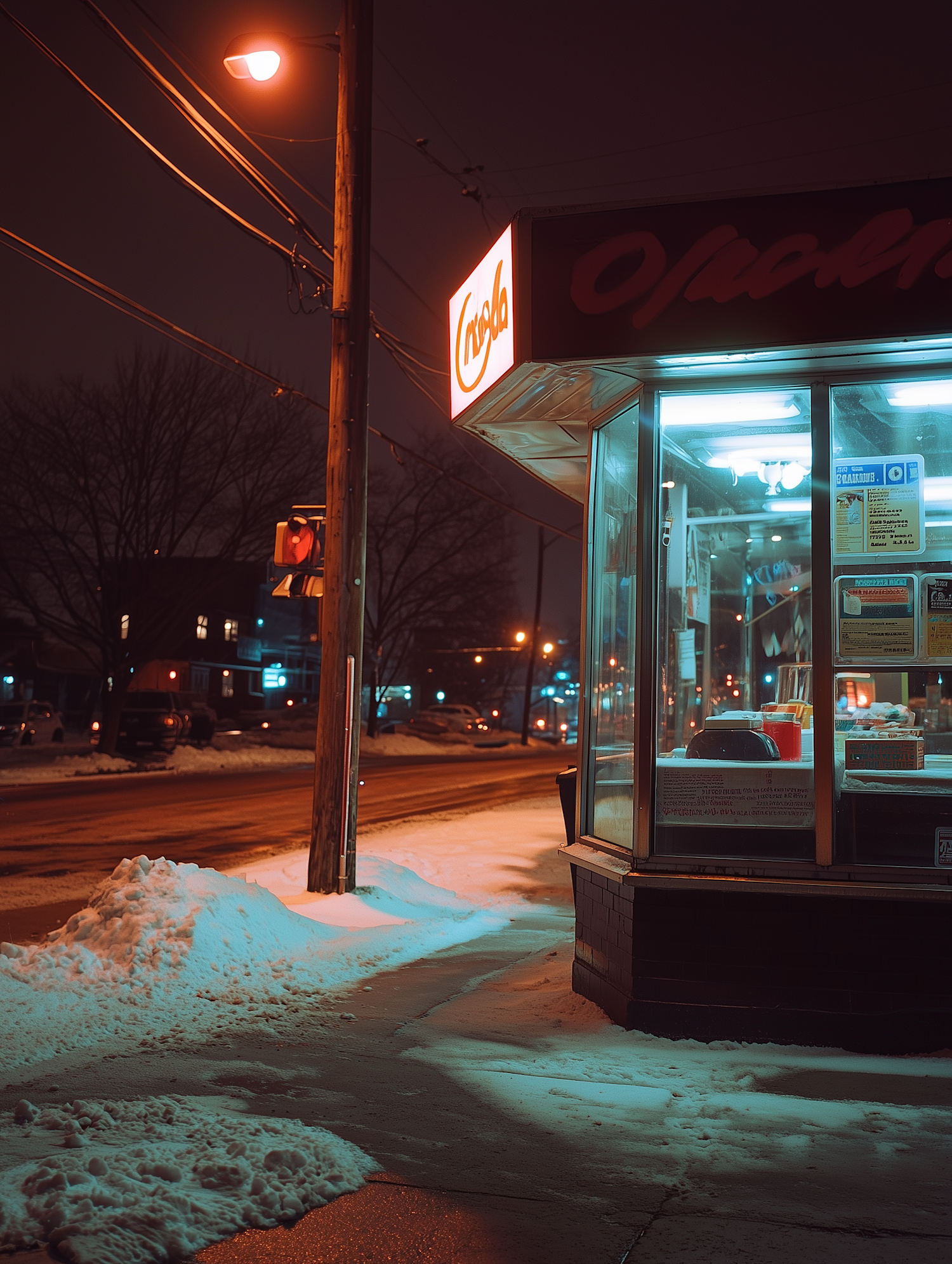 A cozy corner store at night with glowing Coca-Cola signage, snowy sidewalks, and warm streetlights creating a nostalgic urban vibe.