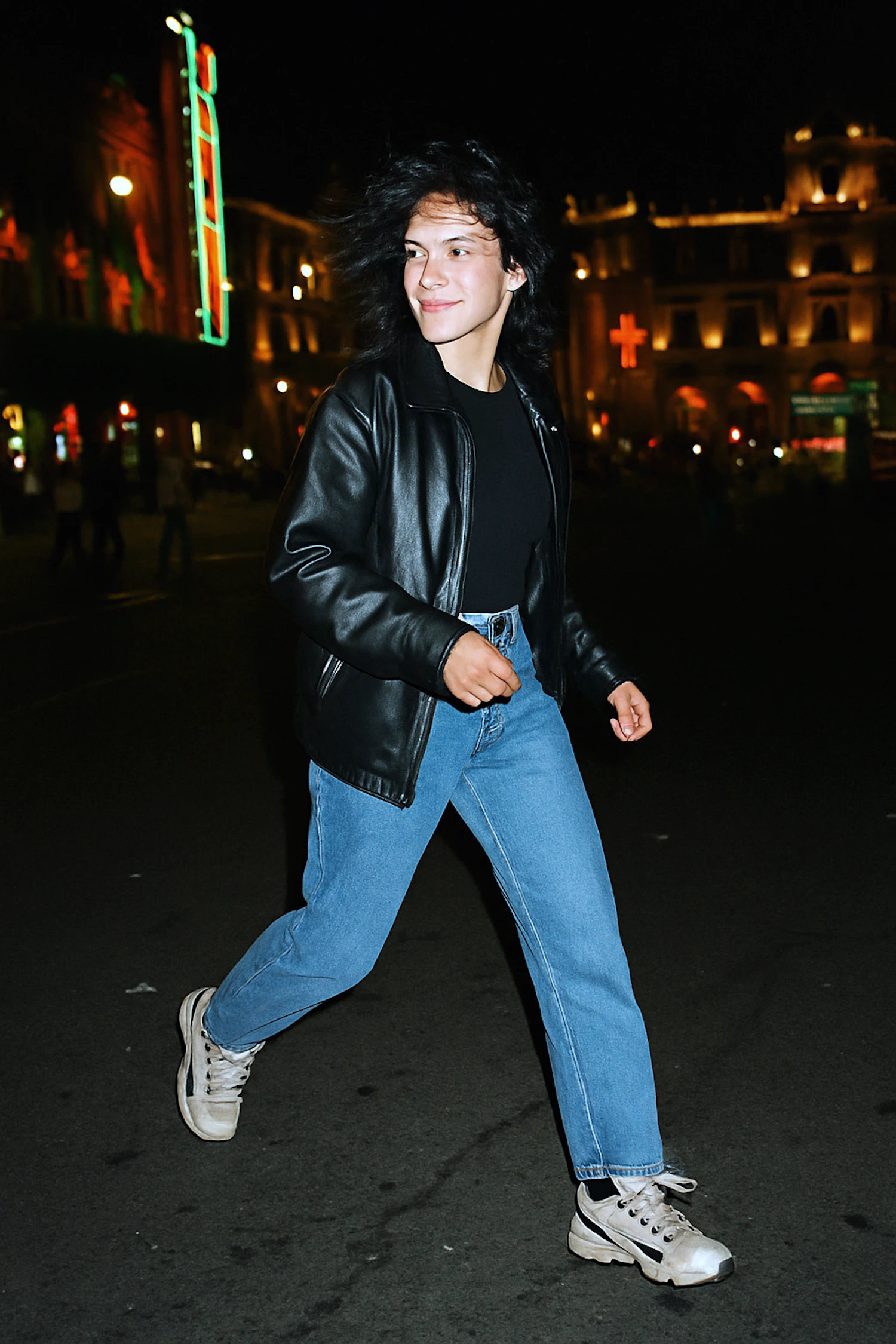 Person in a black leather jacket and jeans walking at night in a vibrant cityscape with illuminated buildings and neon lights.