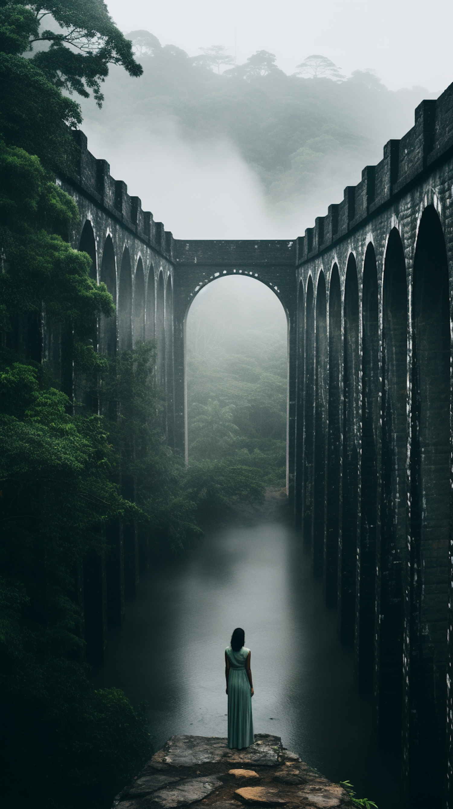 A woman in a green dress stands before a misty viaduct, surrounded by lush greenery and fog, creating a serene and ethereal scene.