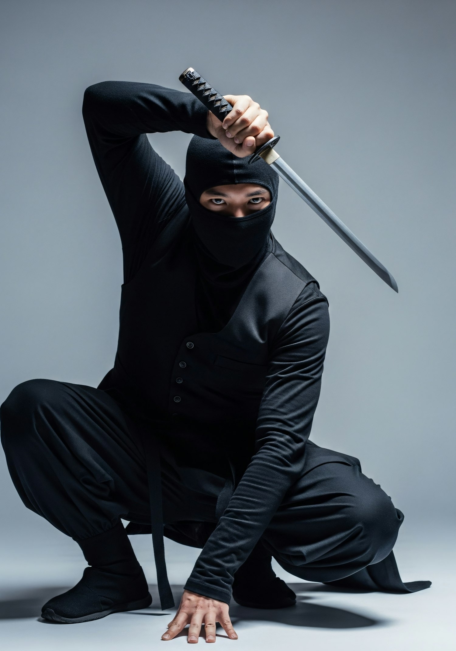 A ninja in a black outfit crouches with a katana, showcasing a dynamic and intense pose against a neutral background.