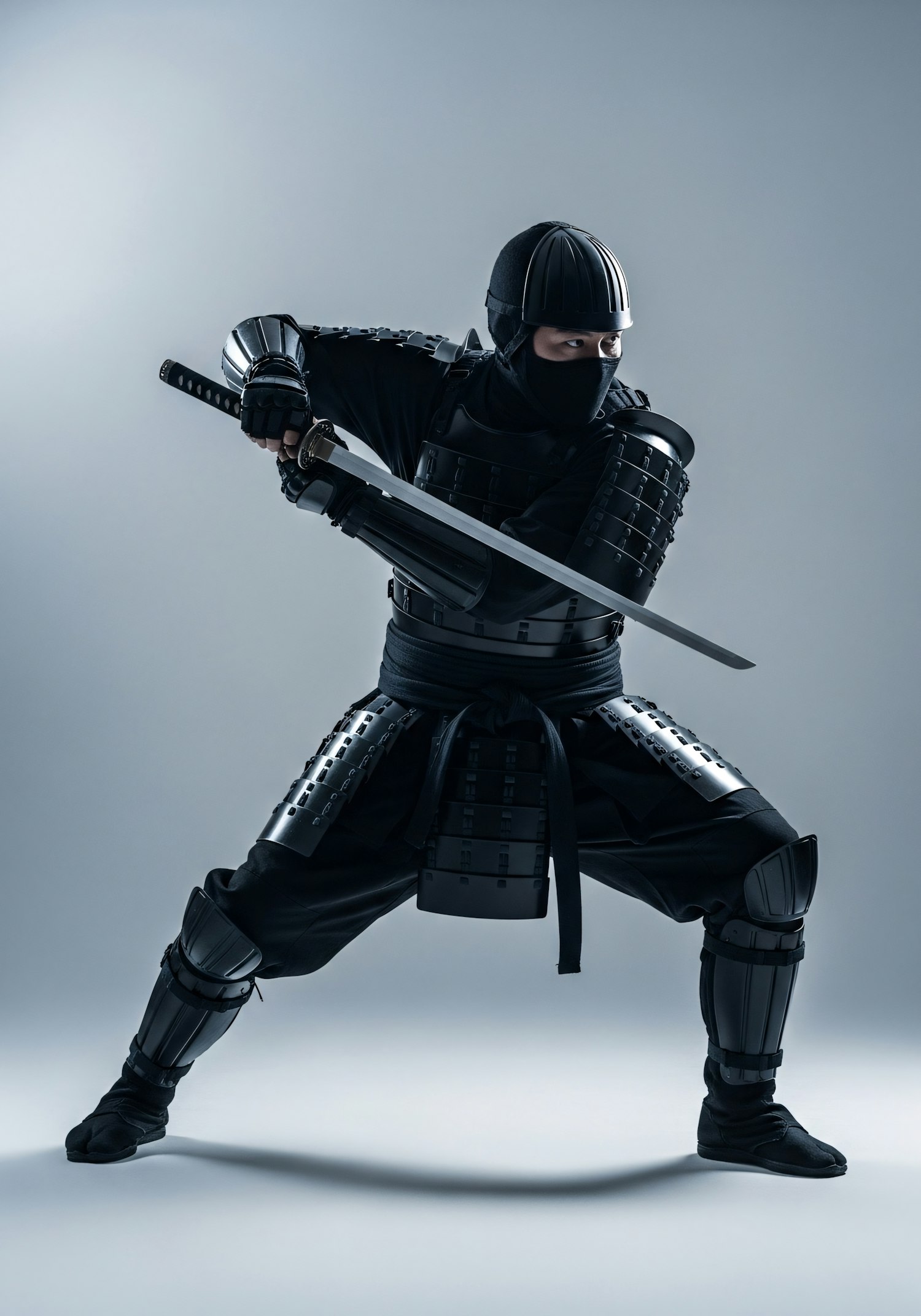 A ninja in black armor holding a katana in a dynamic pose, set against a neutral background, showcasing traditional attire and weaponry.