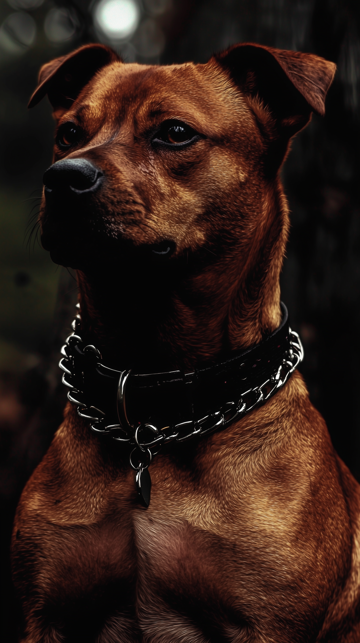 Close-up of a brown dog with a leather and chain collar, gazing attentively in a dark, blurred background. Striking and noble look.