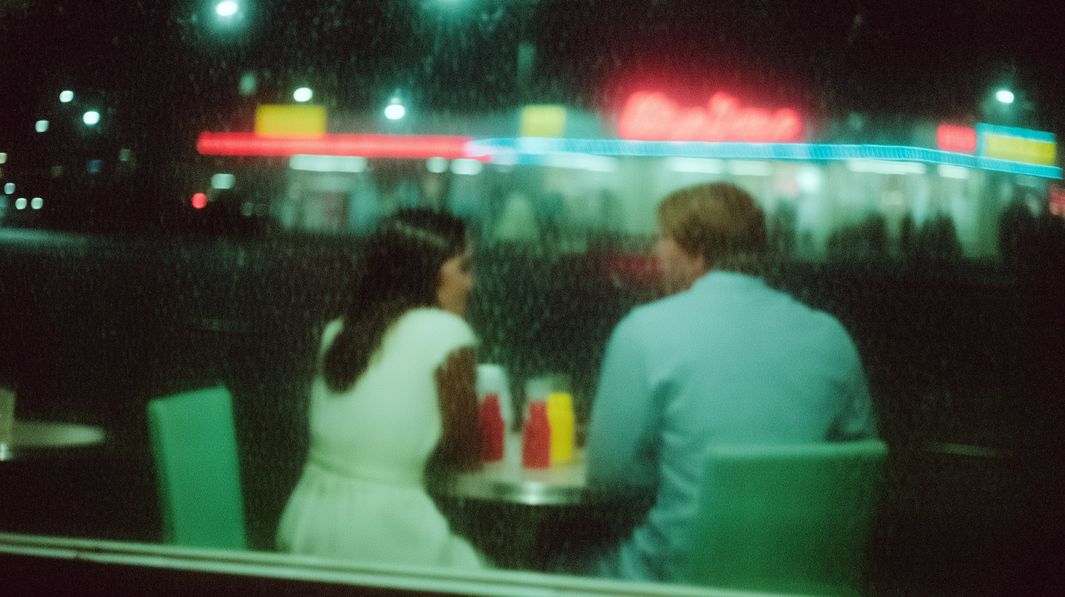 A nighttime diner scene with two people conversing at a table, viewed through a window with neon lights in the background.