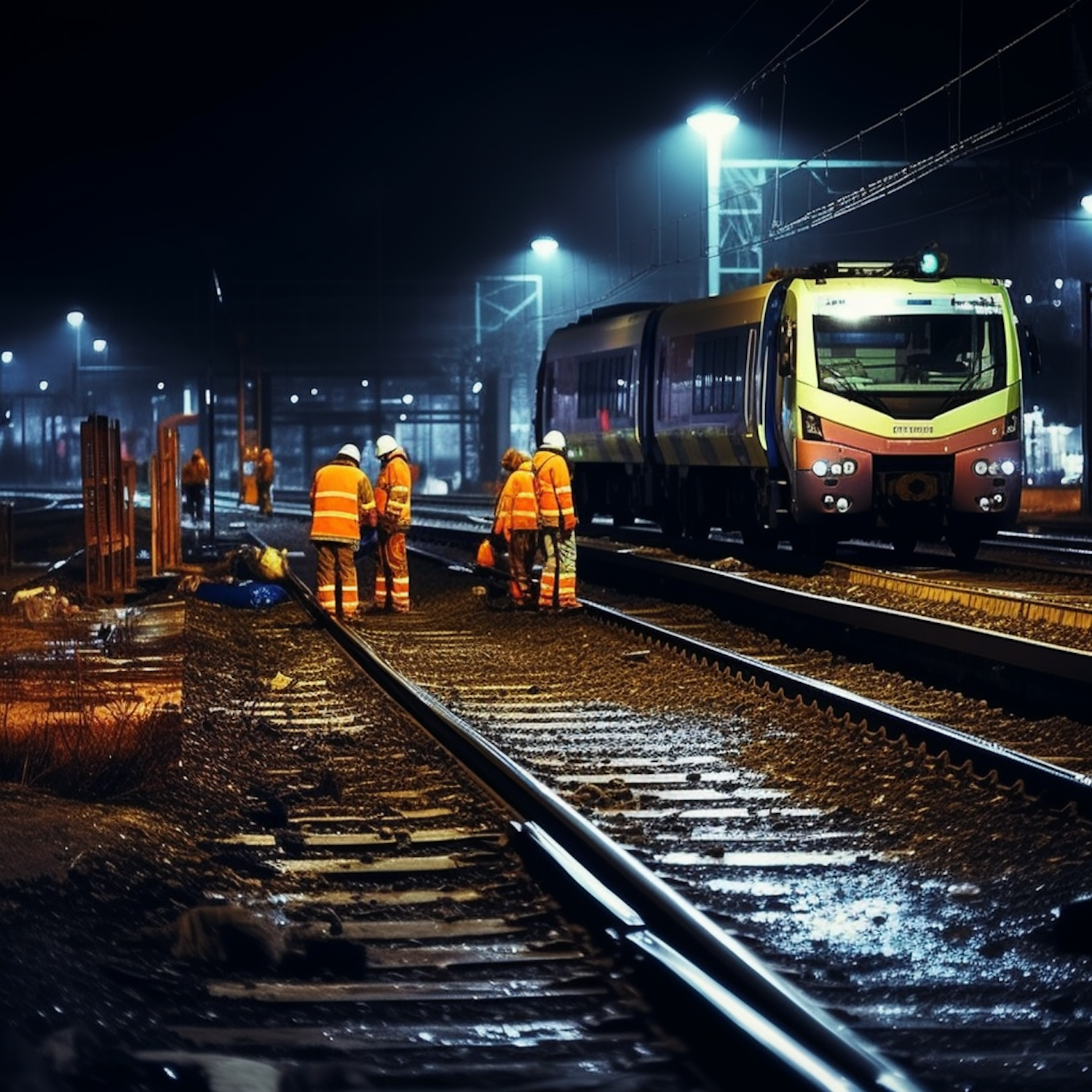 Railway workers in orange safety gear inspect tracks at night, with a train nearby under dim lighting.