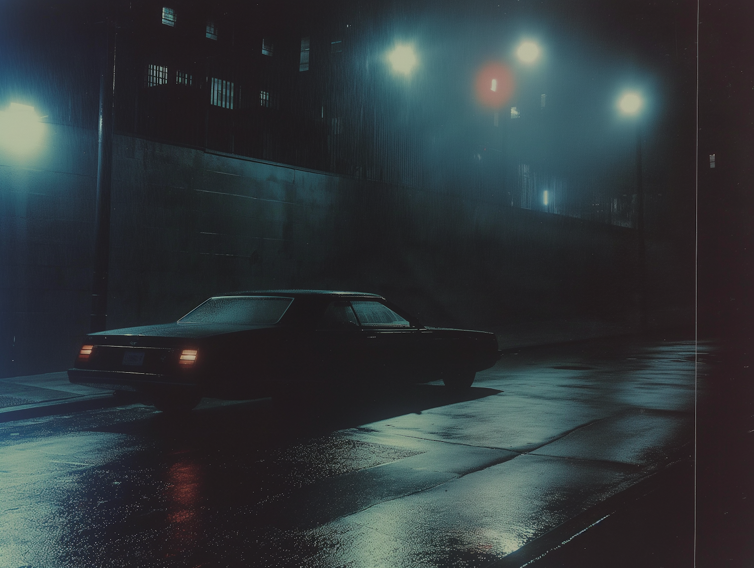 Moody night scene with a vintage car on a wet street, illuminated by bluish streetlights, creating a noir-like atmosphere.