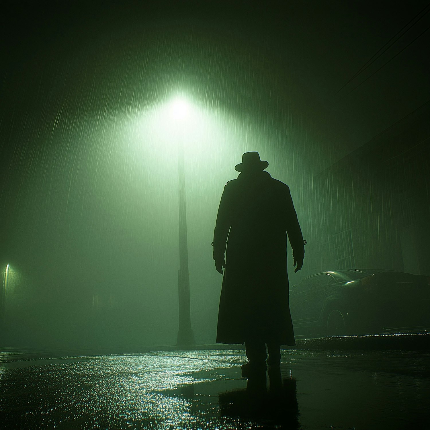 A mysterious figure in a trench coat stands under a glowing streetlight in the rain, creating a cinematic noir vibe with dramatic lighting.