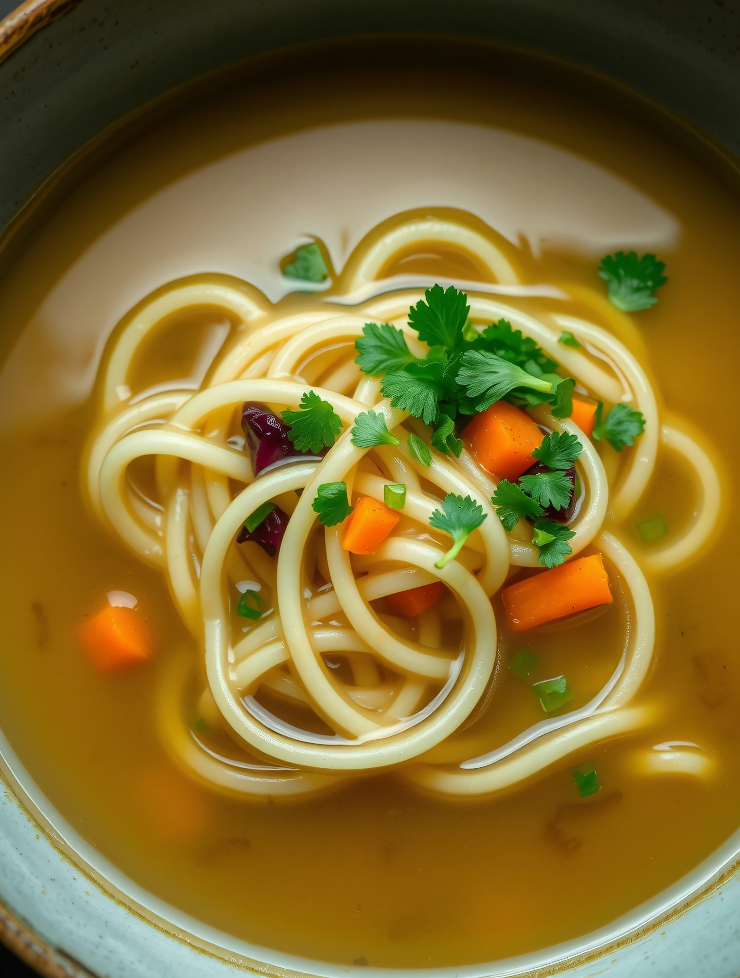 Delicious noodle soup with cilantro, carrots, and herbs in a rich golden broth. Perfect for a comforting meal.