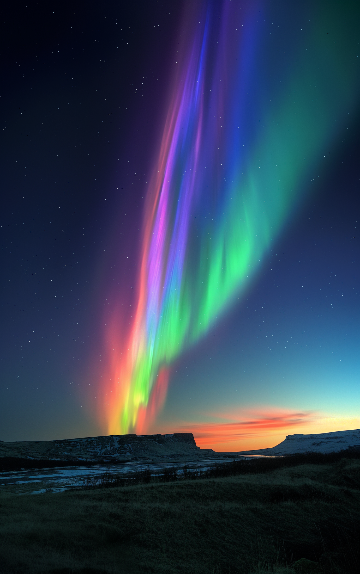 Vibrant Northern Lights in a starry sky over a dark, snowy landscape with a glowing horizon. A stunning natural spectacle.