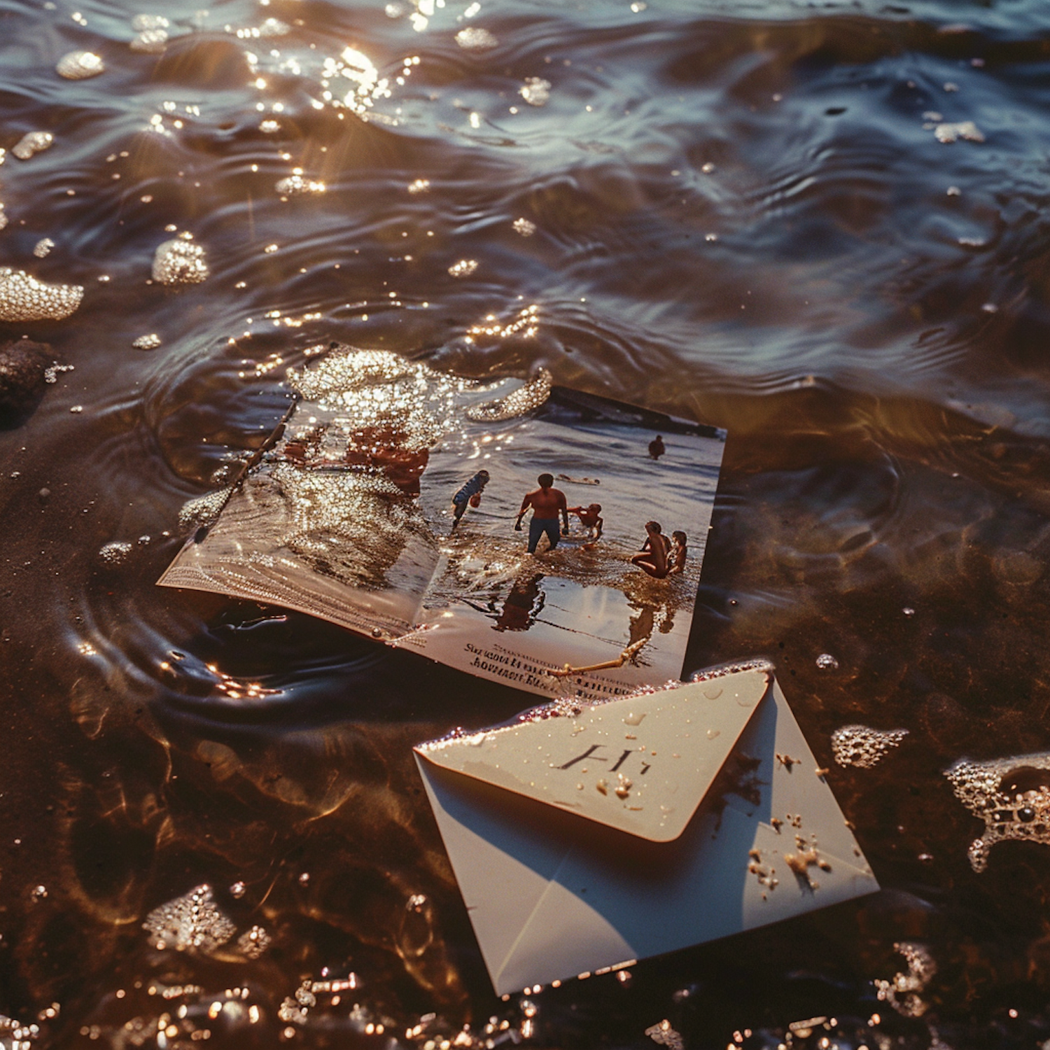 A nostalgic scene of a photograph and envelope in sunlit water, capturing fleeting beach memories.
