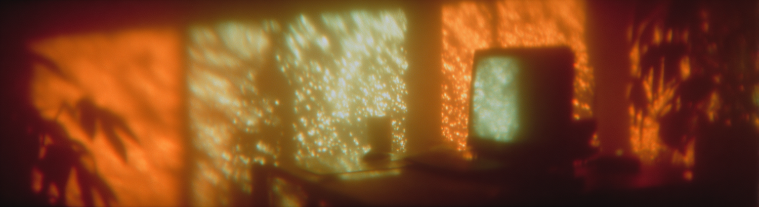 A warm, nostalgic scene with sunlight casting patterns on a wall, a glowing vintage TV, and plant silhouettes creating a serene ambiance.