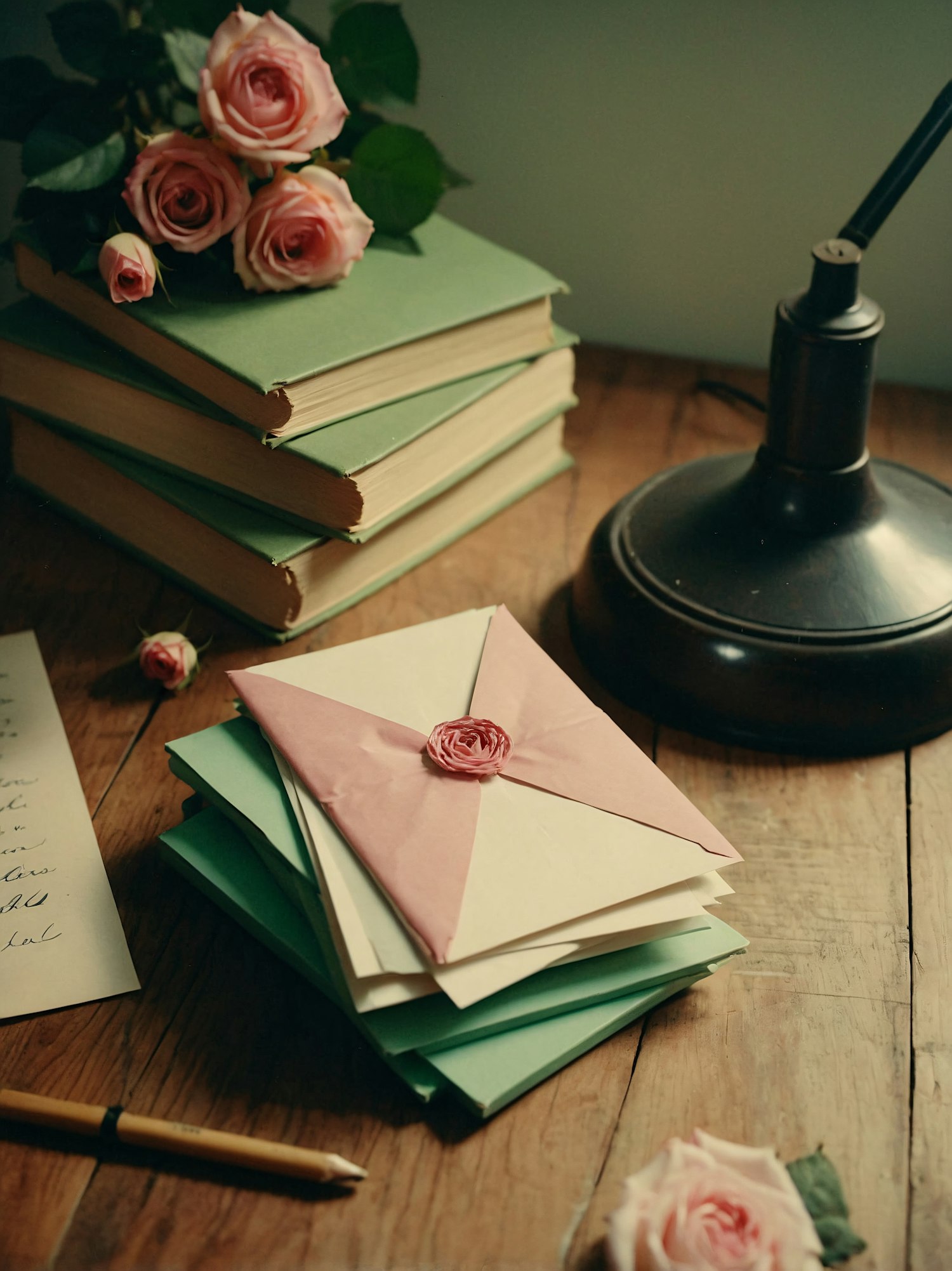Vintage scene with green books, pink roses, and letters on a wooden table. A black lamp adds warmth and nostalgia to the cozy setting.