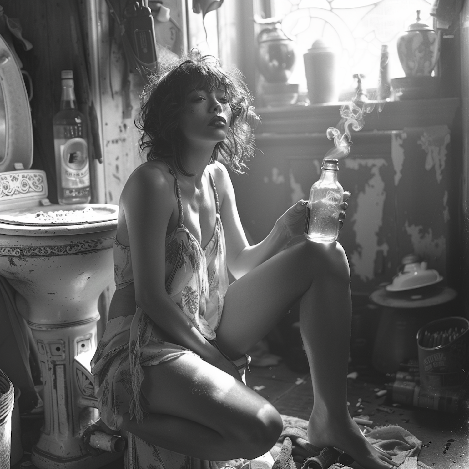 Black and white photo of a woman in a cluttered room, holding a steaming bottle, with light streaming through a window.