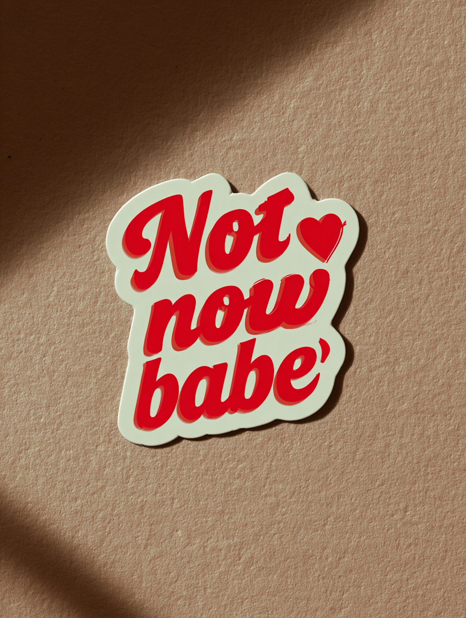 A bold red and white sticker reading 'Not now babe' with a heart, set against a beige textured background with soft shadows.