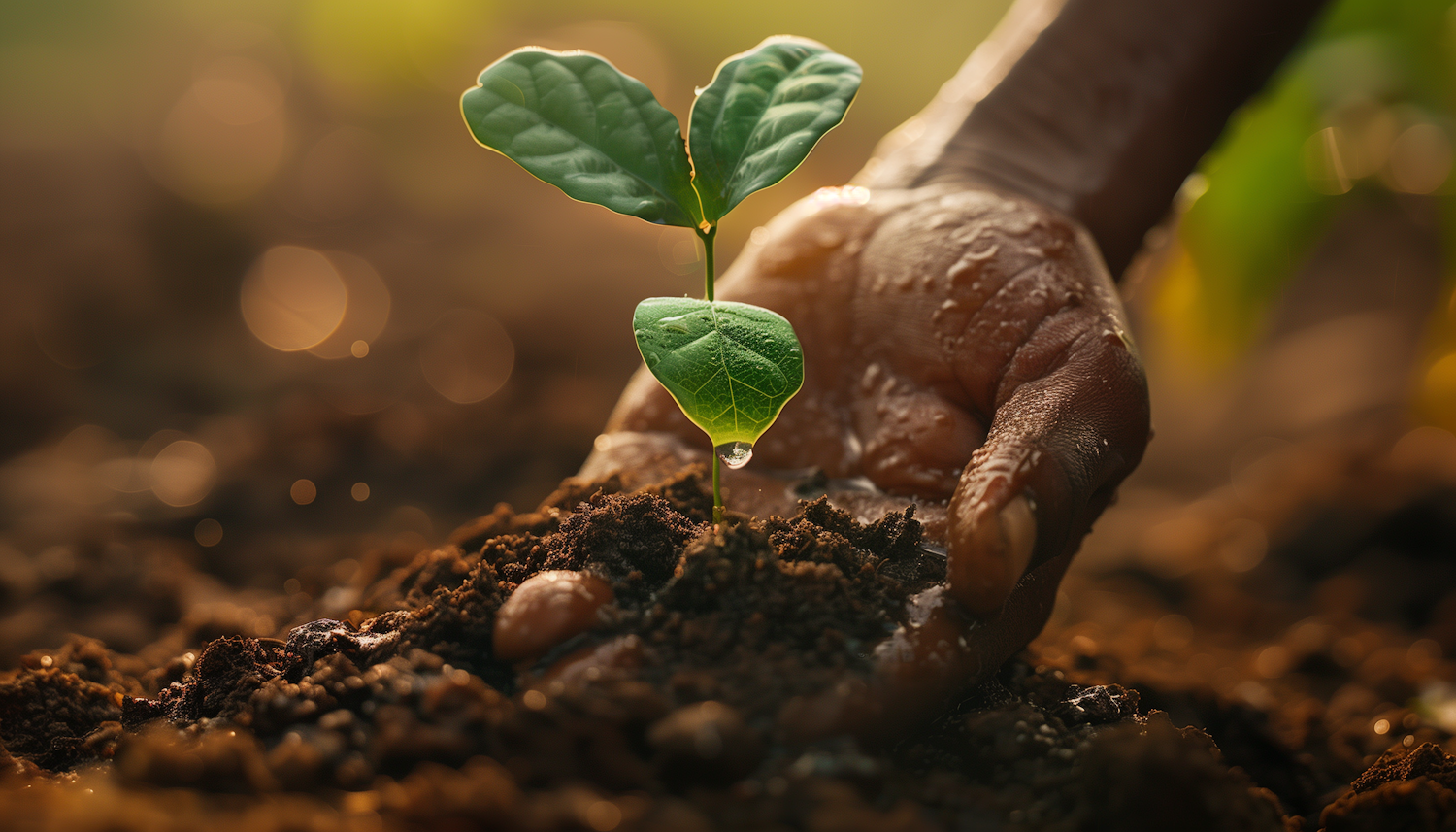 Close-up of a seedling in soil, cradled by a hand, with water droplets and warm bokeh background, symbolizing growth and care.