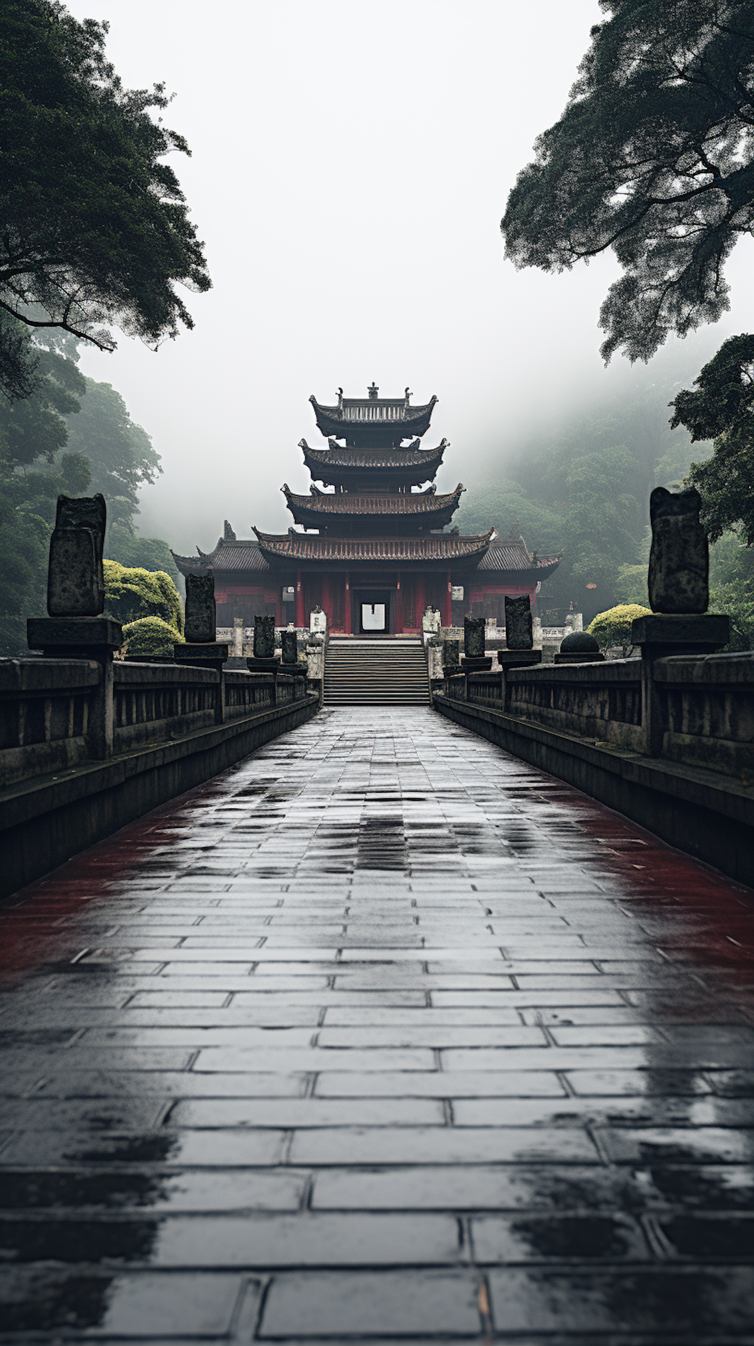 Misty temple scene with a wet stone path, flanked by statues and lush trees, creating a serene and mystical atmosphere.
