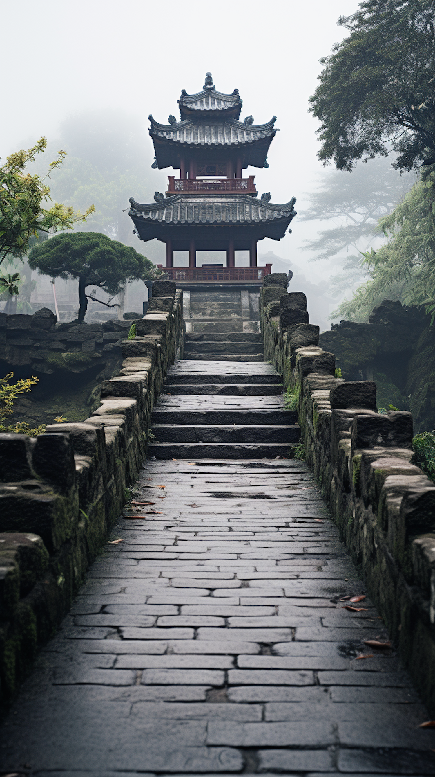 Misty scene with a traditional Asian pagoda and stone pathway, surrounded by lush greenery and an overcast sky.