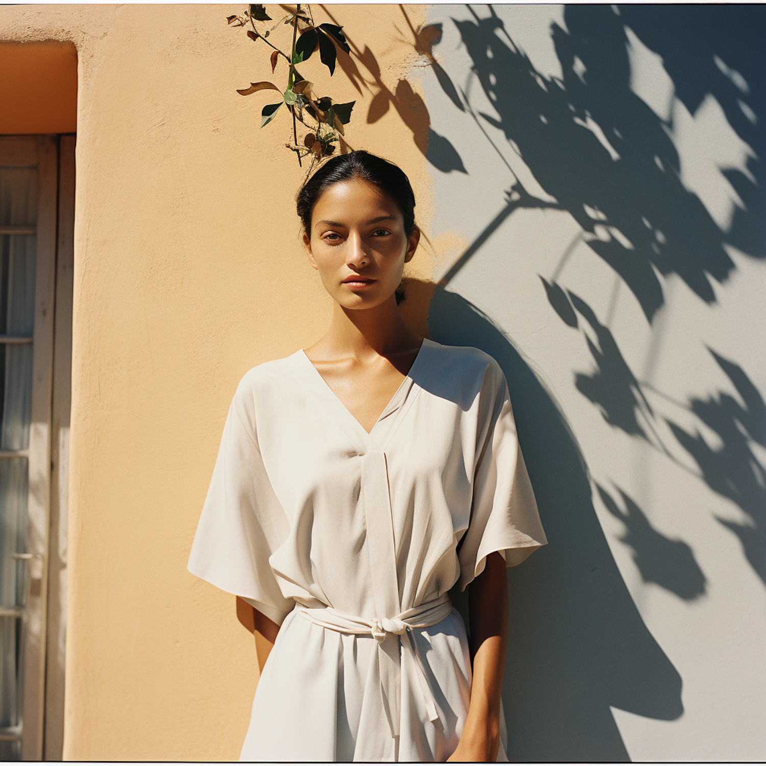 Elegant woman in a white dress stands against a two-toned wall with leaf shadows, exuding minimalist style and natural beauty.