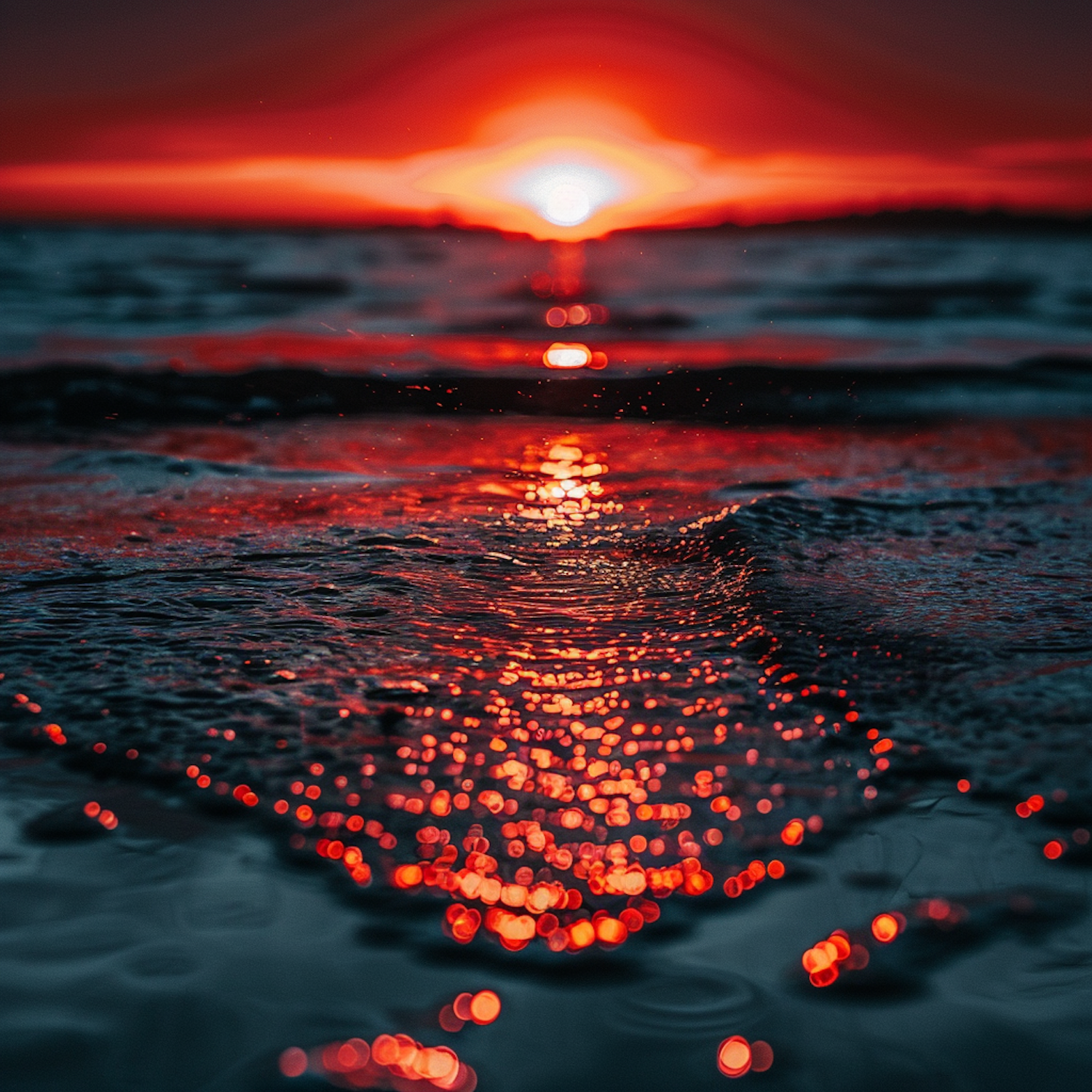 Stunning sunset over the ocean with vibrant red and orange hues reflecting on gentle waves, creating a serene and captivating scene.