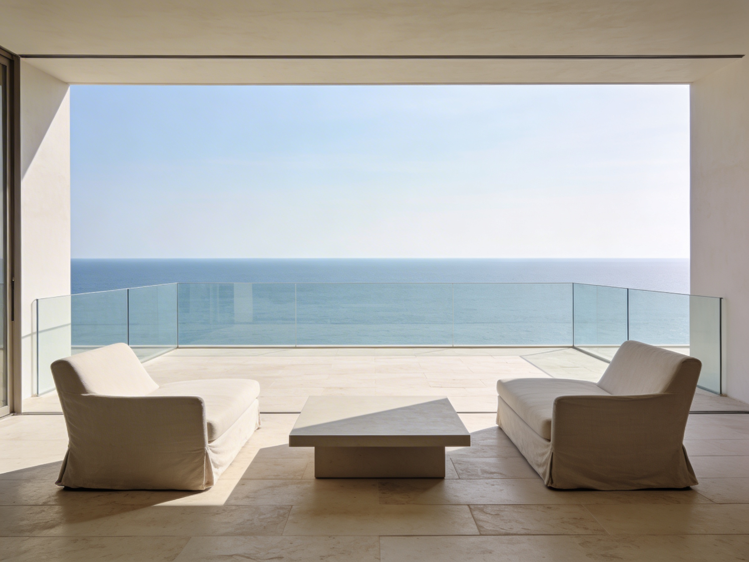 Minimalist patio with white chairs, a sleek table, and a glass railing overlooking a calm ocean and clear sky.