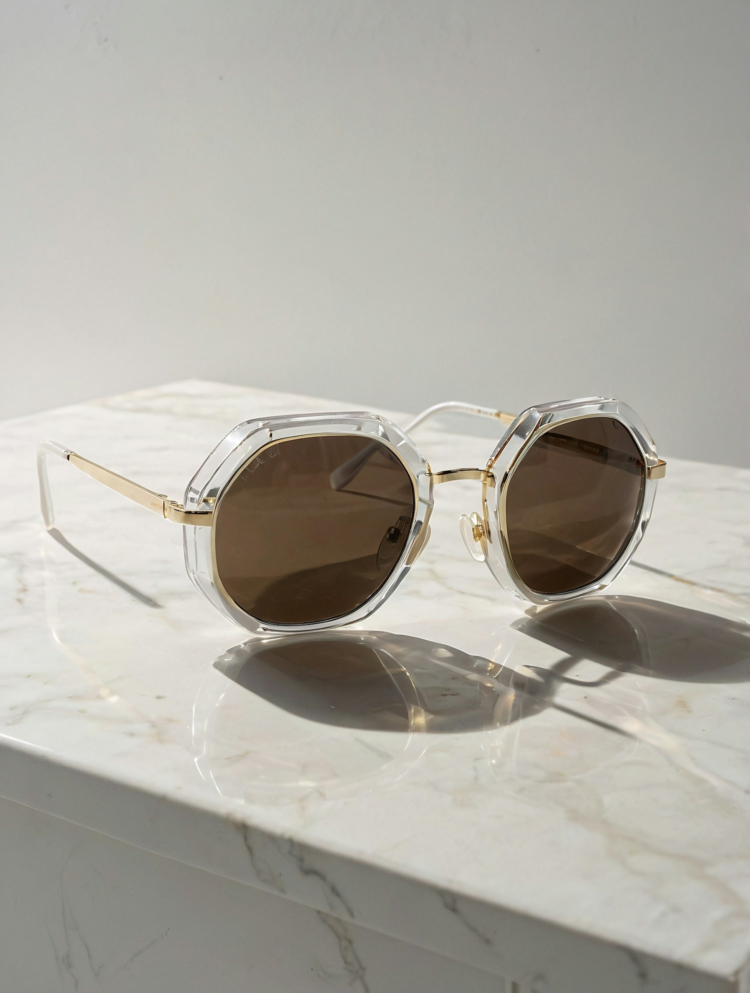 Chic octagonal sunglasses with clear frames, gold accents, and dark brown lenses on a sleek white marble surface.