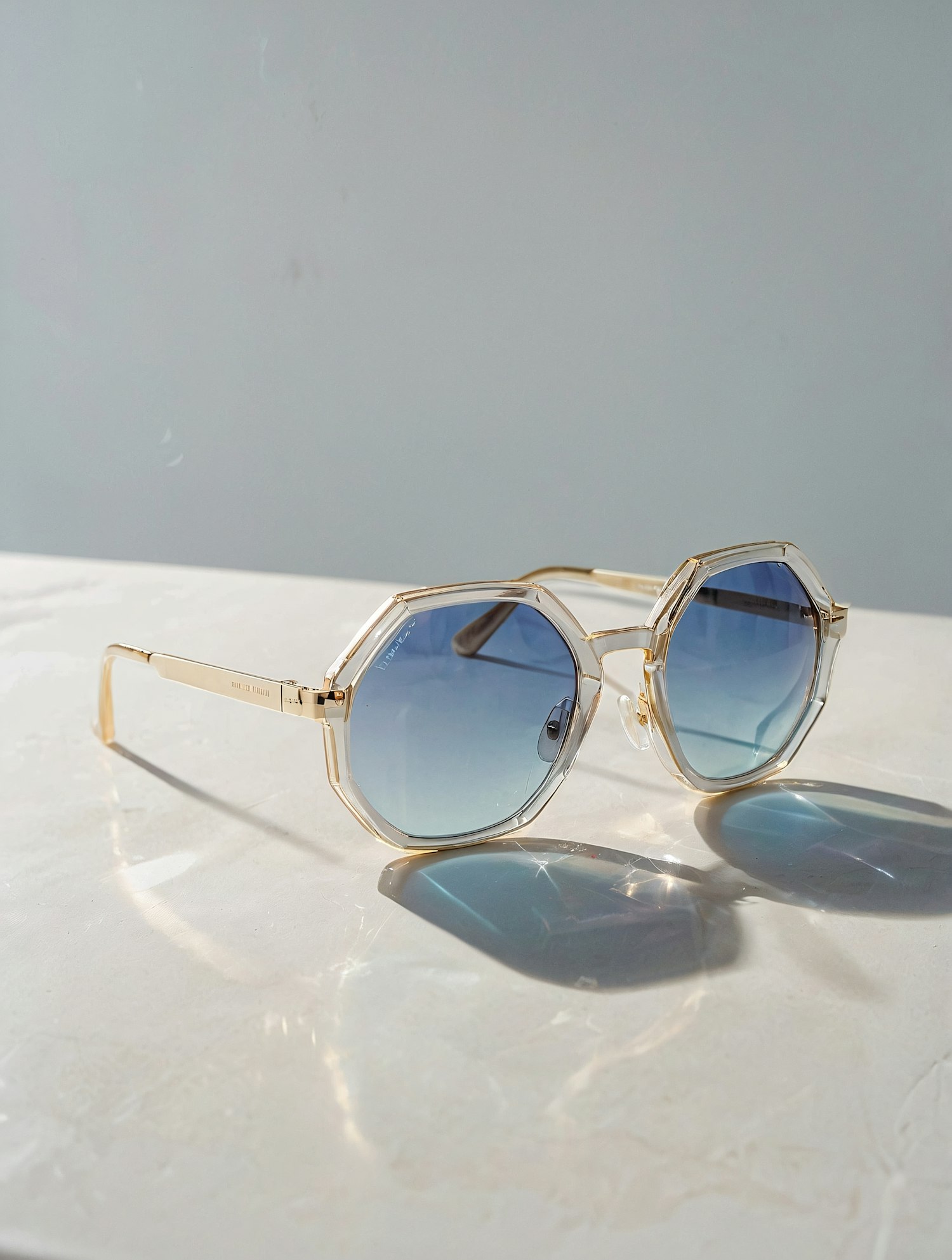Elegant gold-framed sunglasses with gradient blue lenses on a sleek surface, perfect for a modern and stylish look.