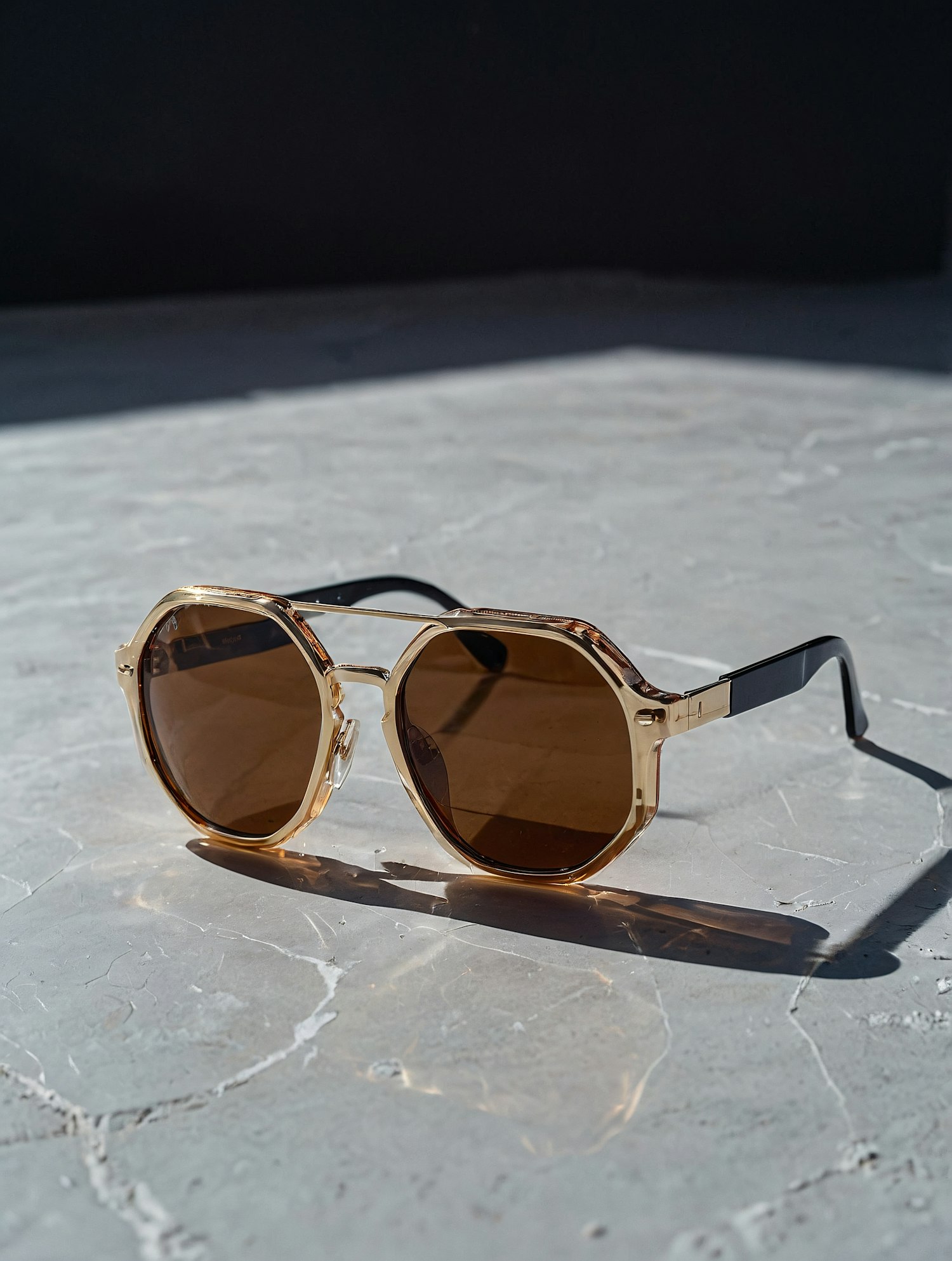 Chic octagonal sunglasses with gold frames and brown lenses on a marble surface, perfect for a modern and stylish look.