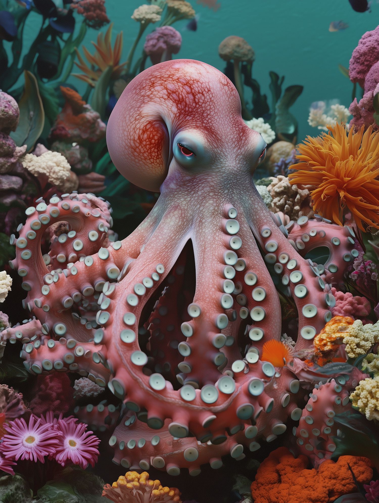 A stunning octopus resting in a colorful coral reef, surrounded by vibrant marine life and a teal ocean backdrop.