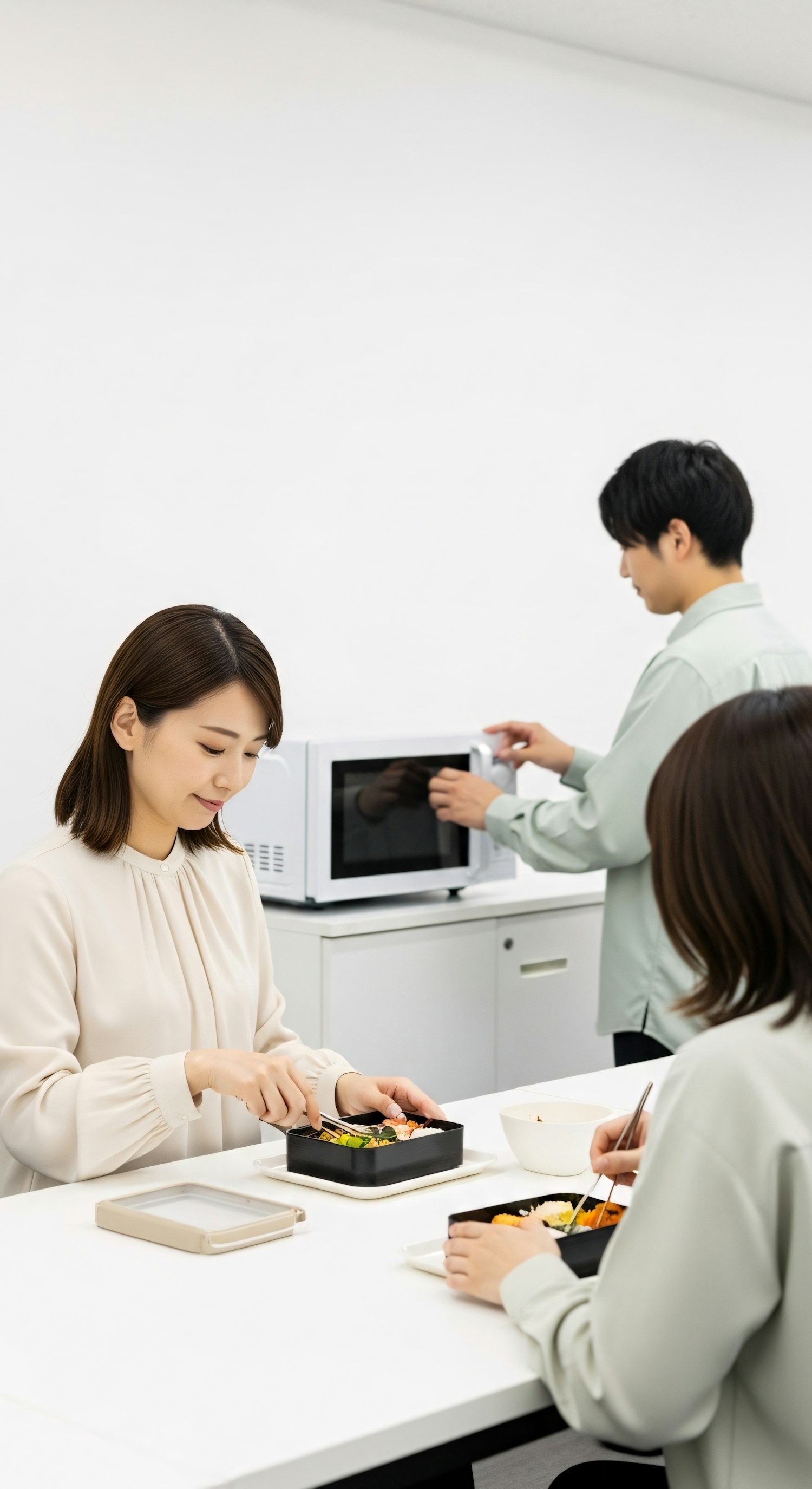 Three colleagues enjoy lunch in a bright office break room, with bento boxes and a microwave in use, creating a casual and friendly vibe.