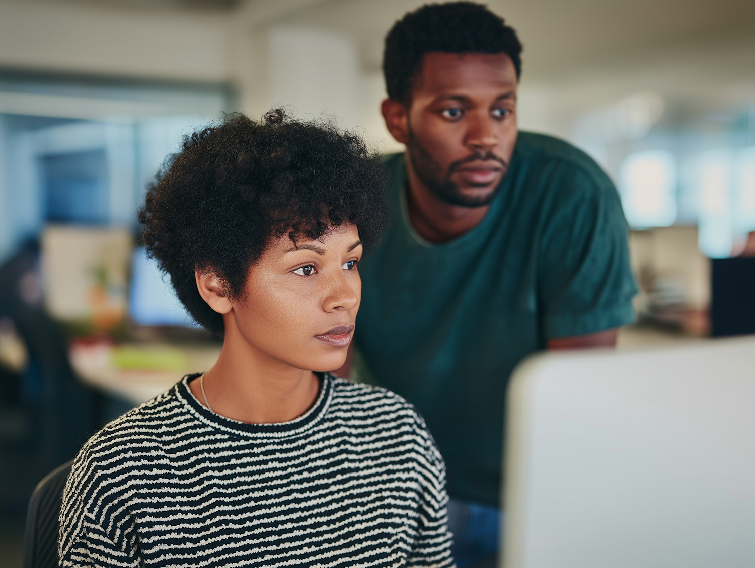 Two colleagues collaborating on a project in a modern office, focused on a computer screen, showcasing teamwork and productivity.