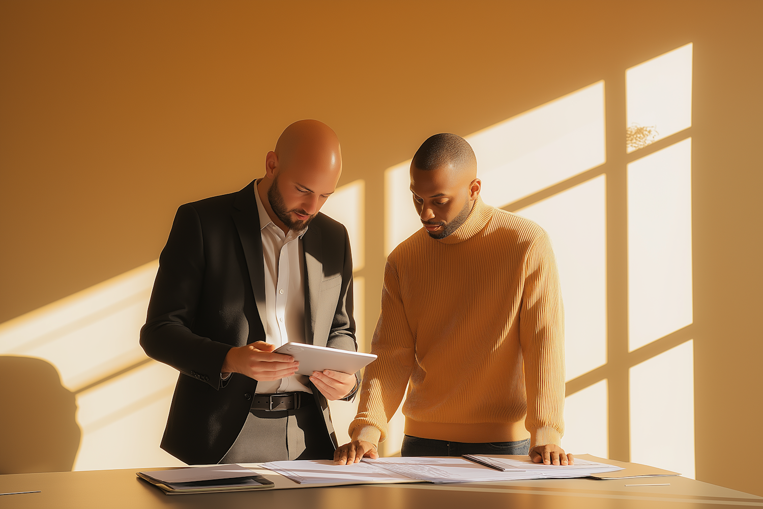 Two men collaborating in a sunlit office, reviewing documents and a tablet. Warm tones and natural light create a productive ambiance.