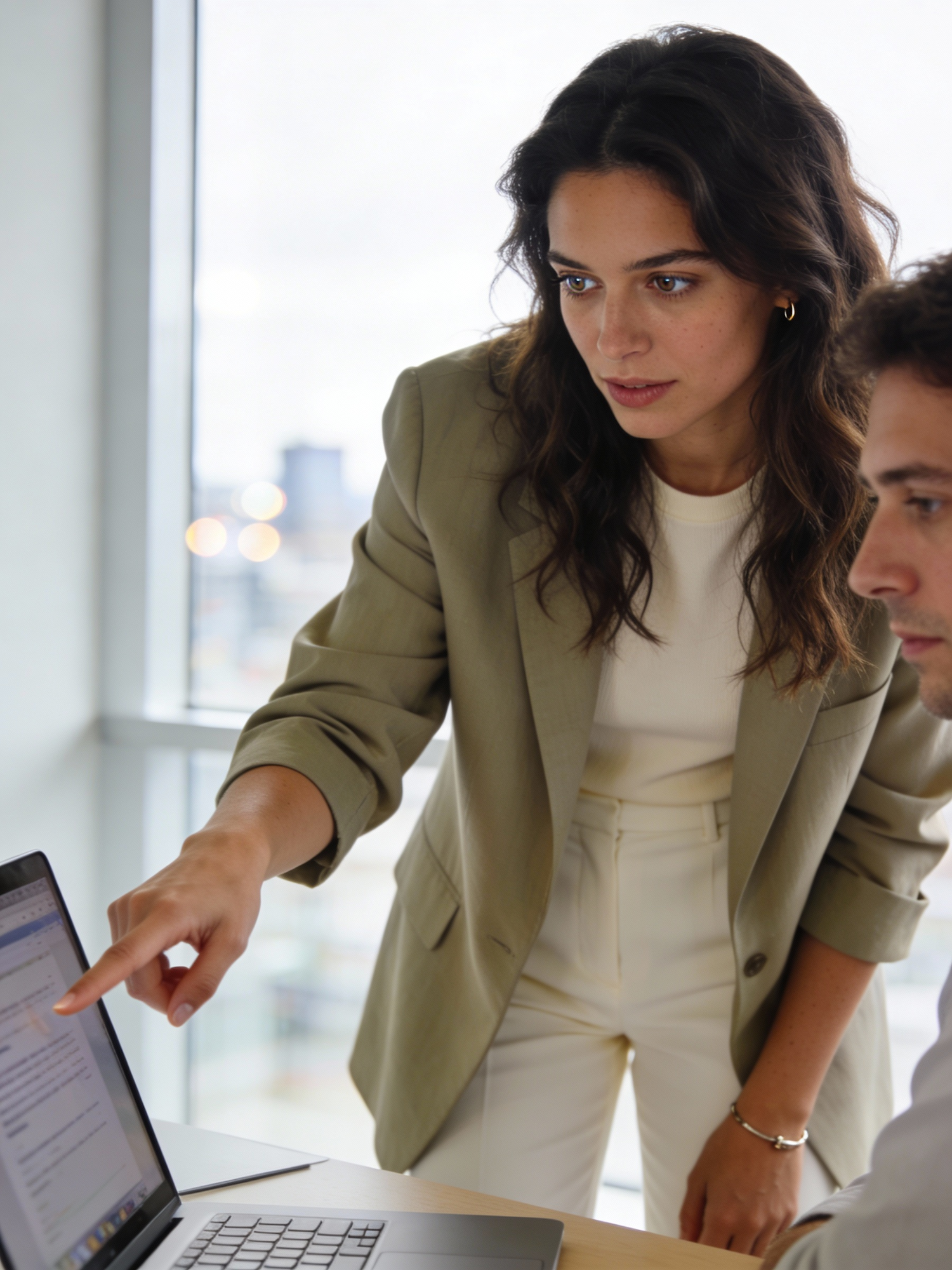 A professional woman in a blazer points at a laptop screen, engaging in a discussion in a modern office setting.