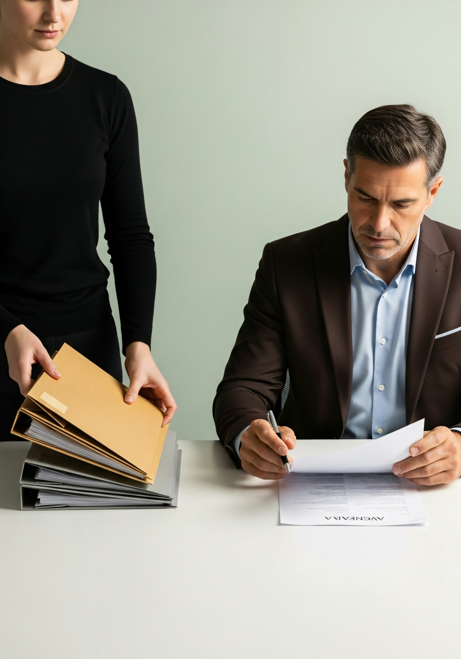 A man in a suit reviews documents at a desk while a woman in black hands him a folder, set against a plain light green background.