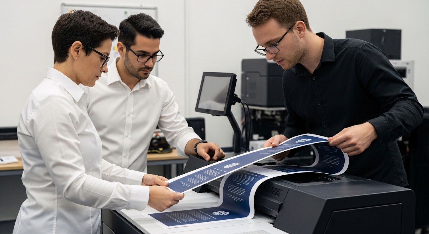 Three professionals review a printed document in an office, showcasing teamwork and modern printing technology.