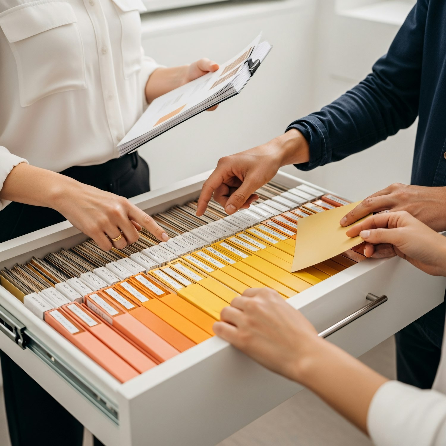 Three people collaborate on organizing files in a drawer, showcasing teamwork and efficiency in an office setting.