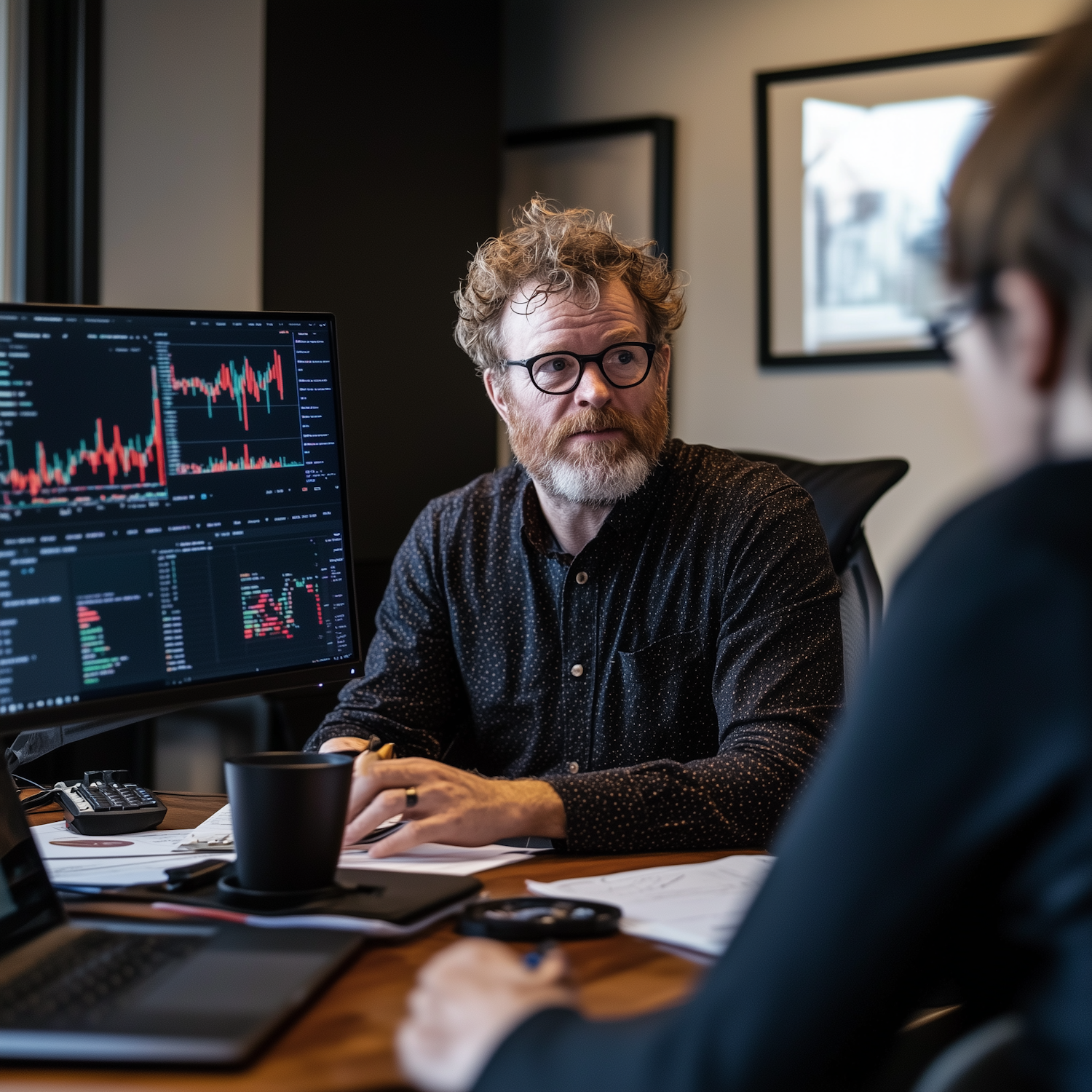 Man with glasses and beard analyzing financial data on a computer screen in an office setting.
