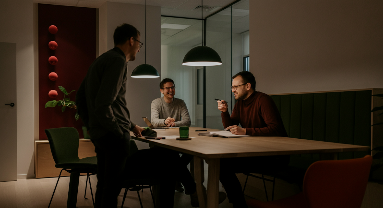 Three men in a modern office setting engaged in a lively discussion around a wooden table, under warm lighting.