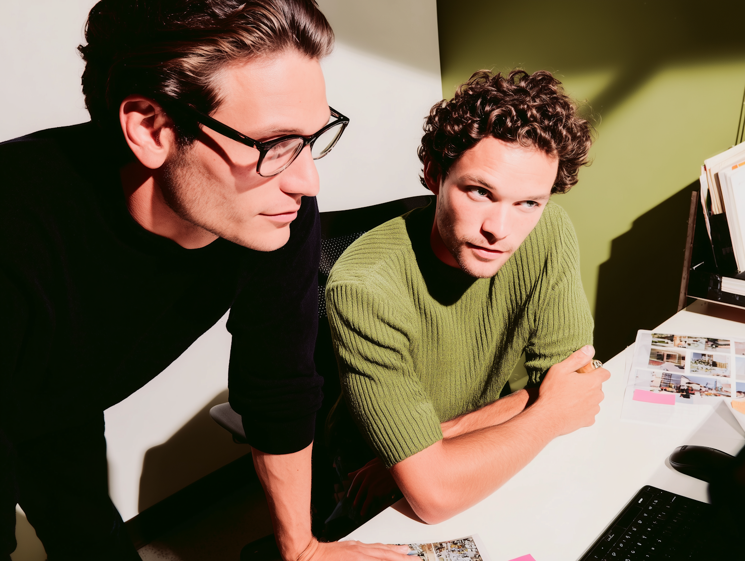 Two men collaborate at a desk in a brightly lit office, surrounded by papers and a computer, suggesting a productive work session.