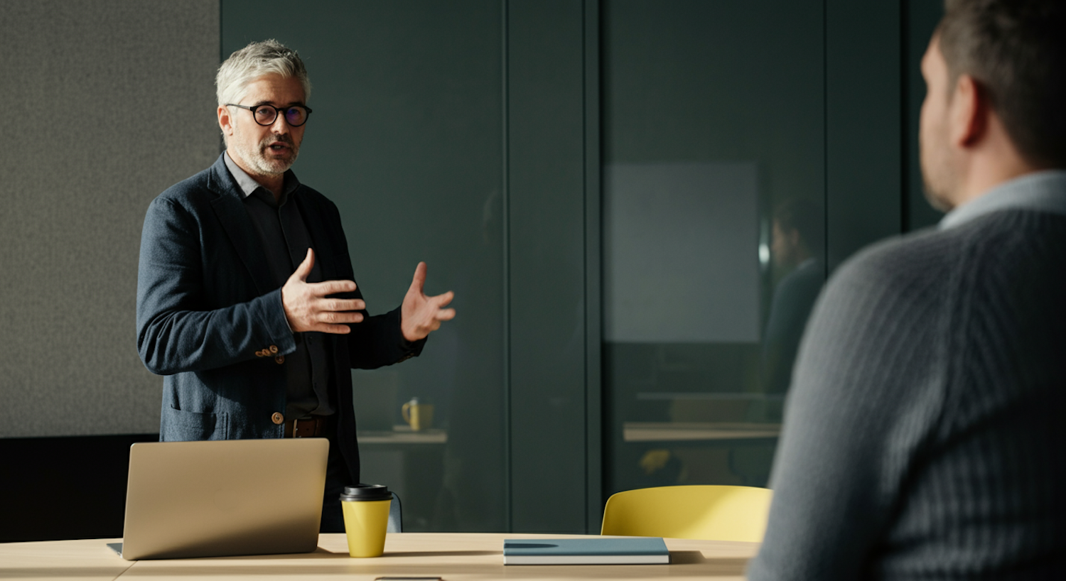 A professional discussion in a modern office setting, featuring two individuals, a laptop, and a coffee cup on a table.