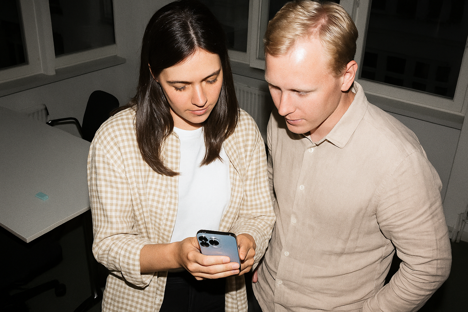 Two people in casual attire closely examining a smartphone in an office-like setting, with a focus on collaboration.