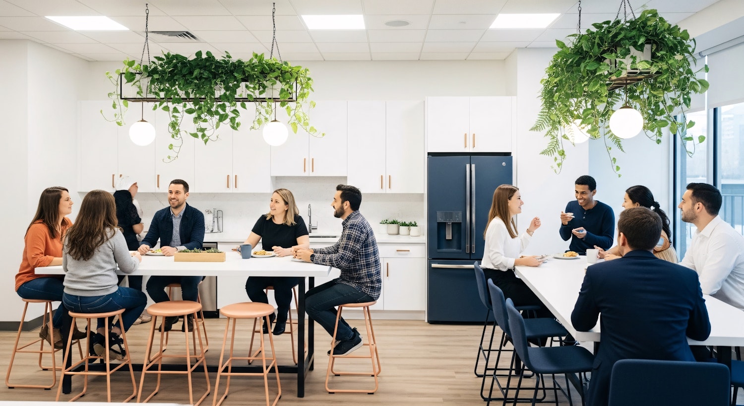 Bright office kitchen with people enjoying food and conversation, featuring modern decor, hanging plants, and a welcoming atmosphere.