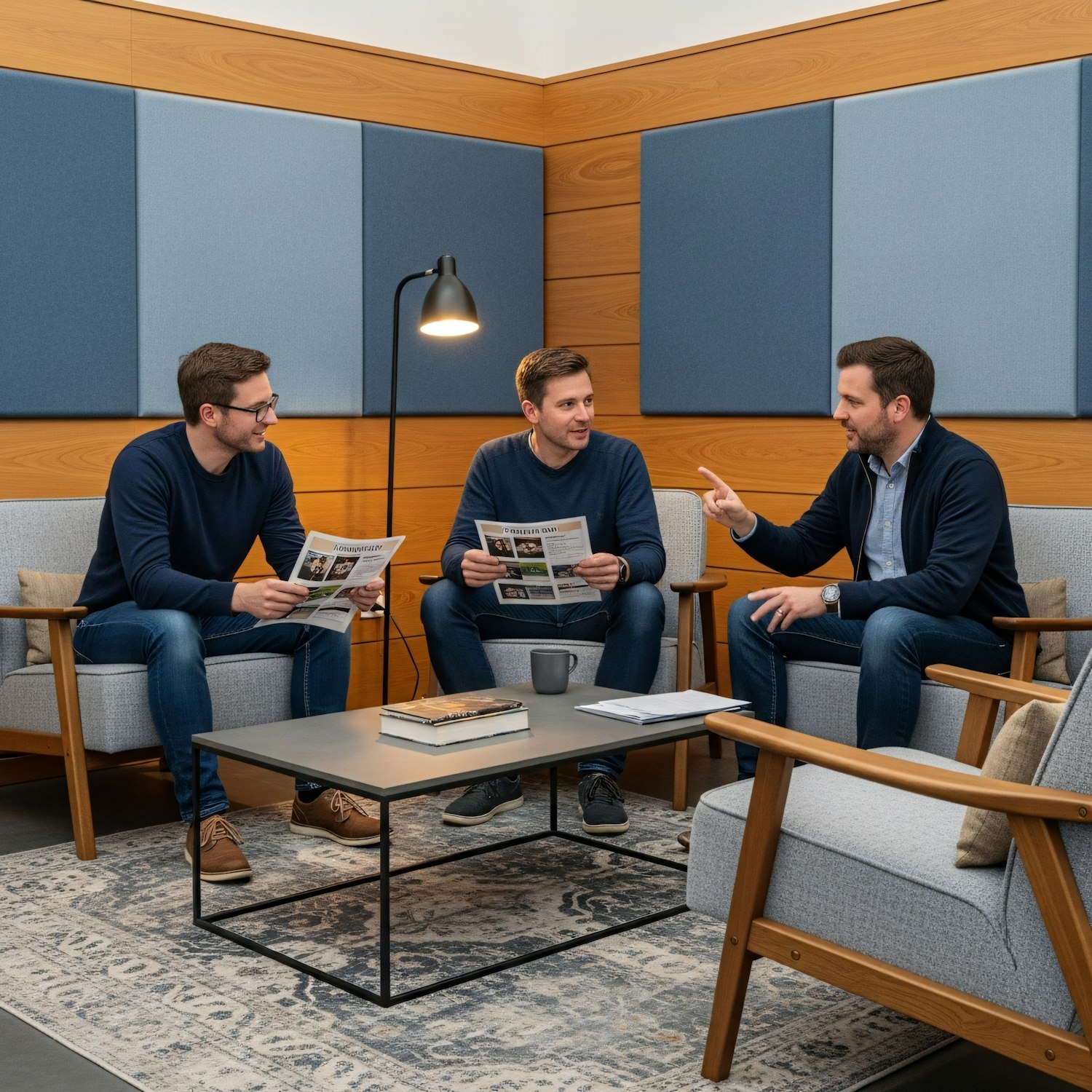 Three men in a modern office lounge discussing while holding newspapers, surrounded by cozy furniture and warm decor.