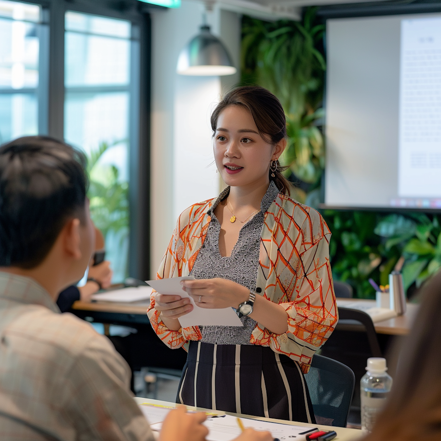 A professional woman speaks to a colleague in a modern office with plants and a projector screen, holding a paper during a meeting.