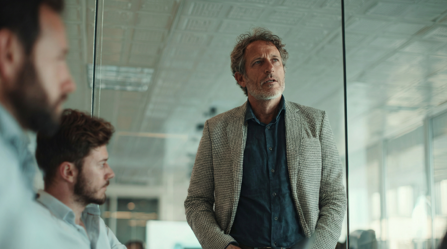 A professional office scene with a man presenting to colleagues, showcasing a modern workspace and engaged discussion.