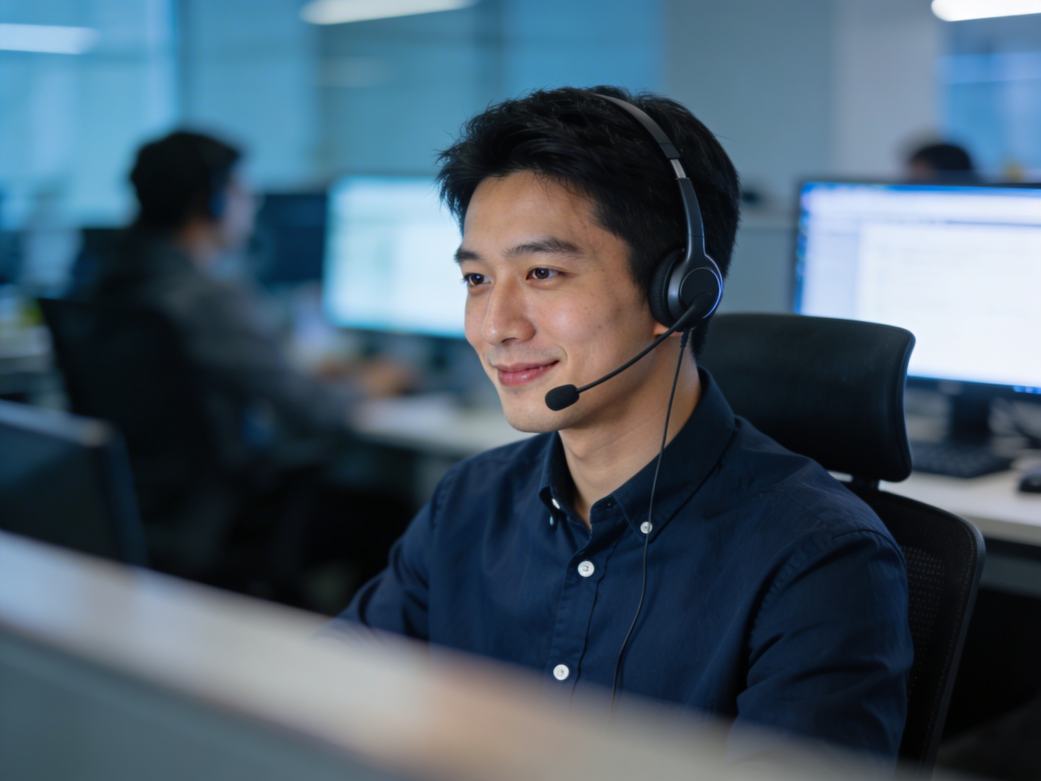A professional in a modern office setting wearing a headset, engaged in a task, with a focused and approachable demeanor.