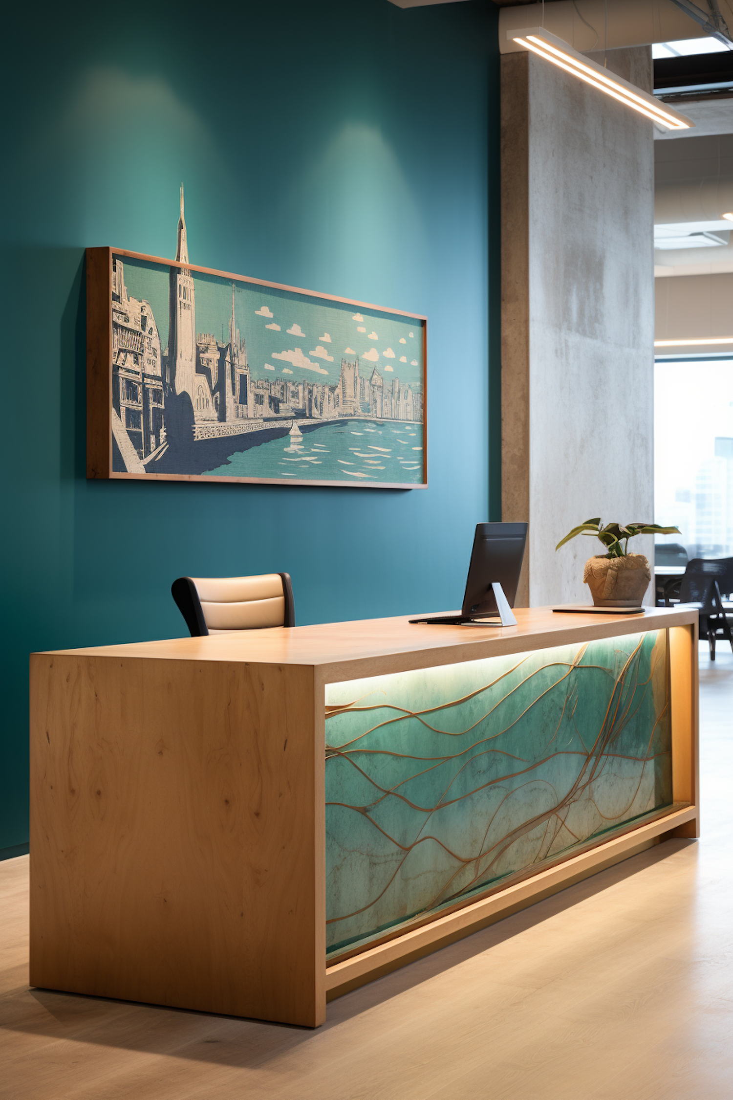 Modern reception area with a wooden desk, abstract art, and teal walls. Features a computer, plant, and cityscape artwork.